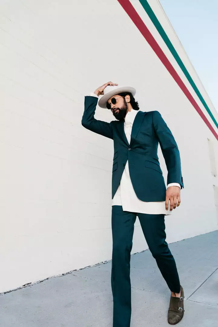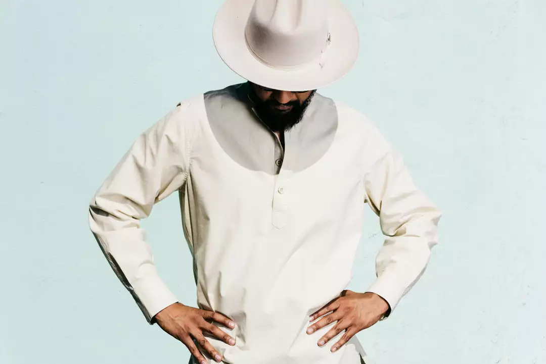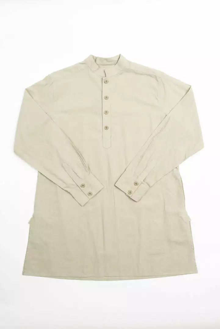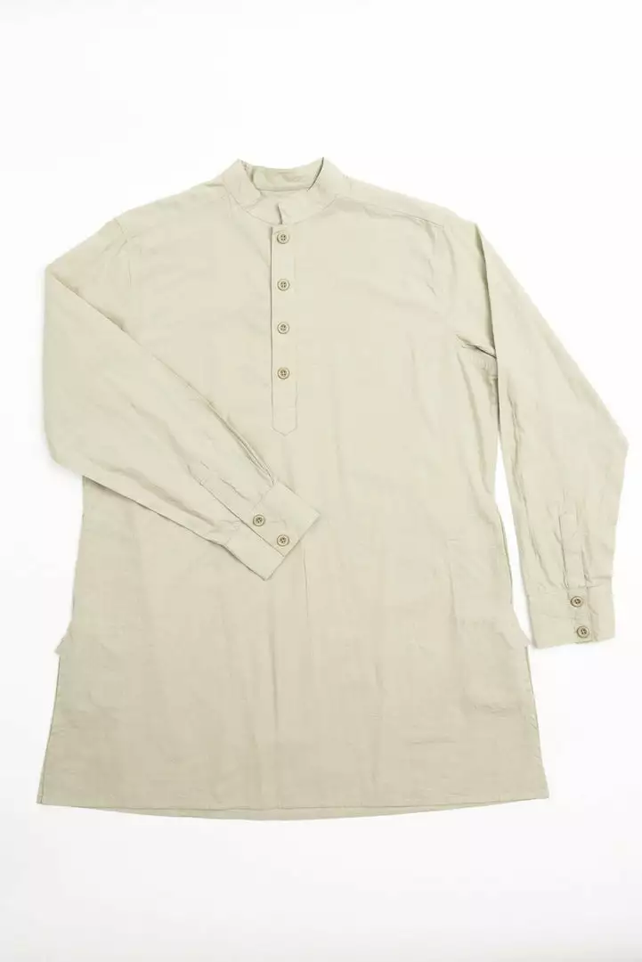 A men’s oversized heritage-style shirt in a pale khaki color. With a partial button-down front, mock collar, and long sleeves, the Bombay can be styled both up and down.