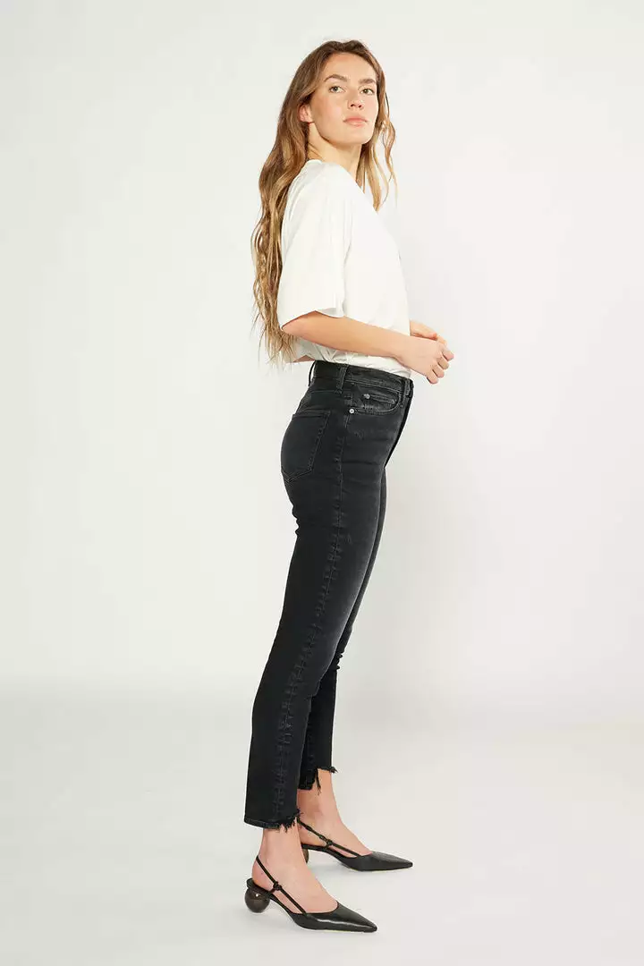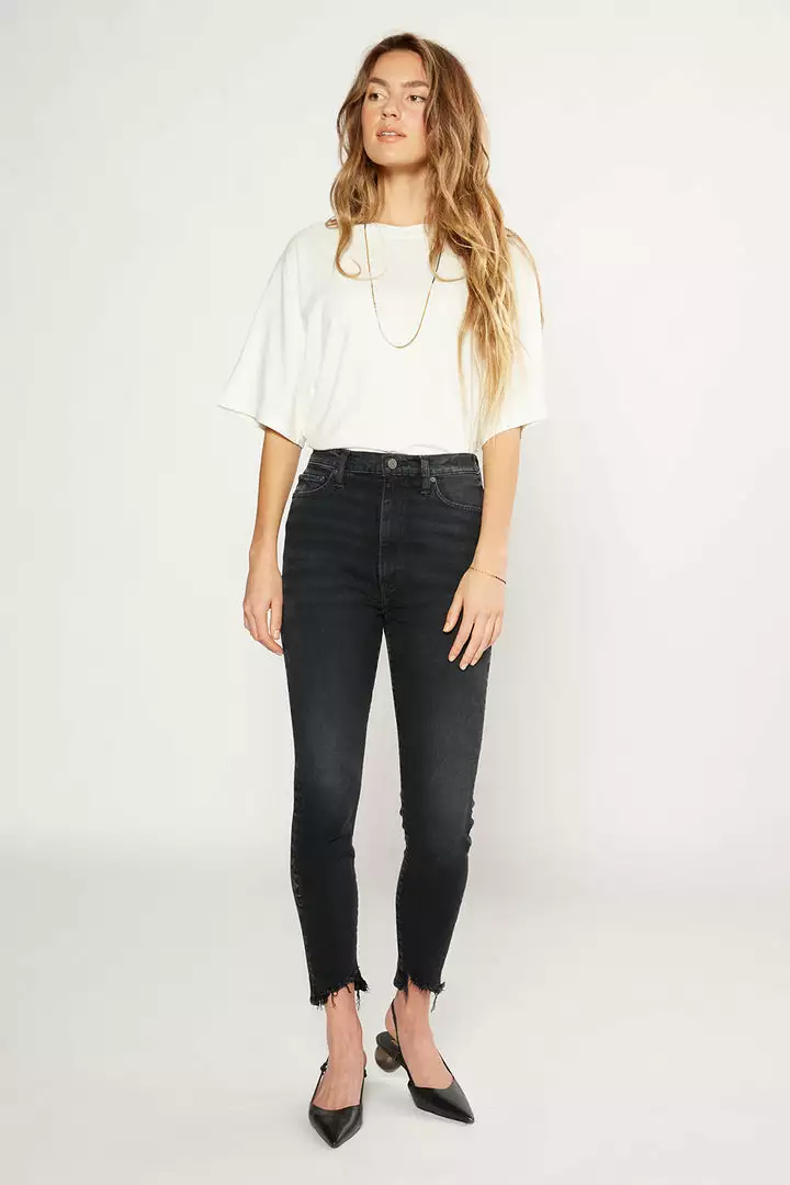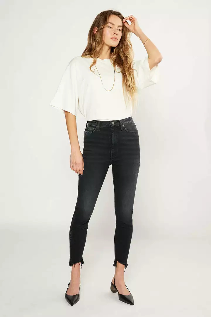 The Cindy Organic Cotton Jeans in Black Creek wash feature a classic skinny fit with a higher rise. Fit is slim from waist to ankle, creating a long, lean silhouette. A sleek black wash with an angular cut hem finish the look.