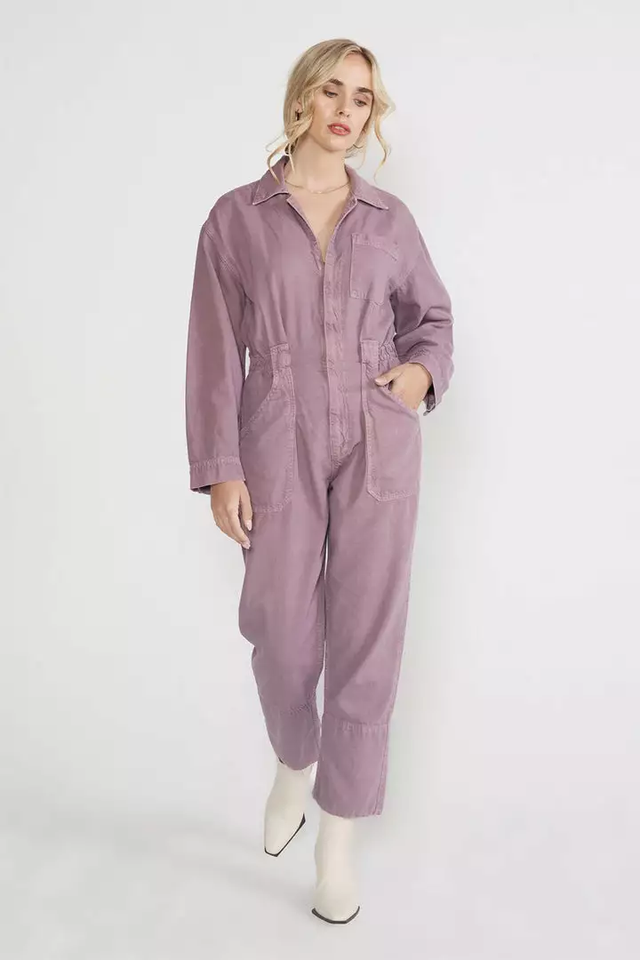 A vintage flightsuit is reimagined with feminine proportions and a soft, lofty organic twill fabric.