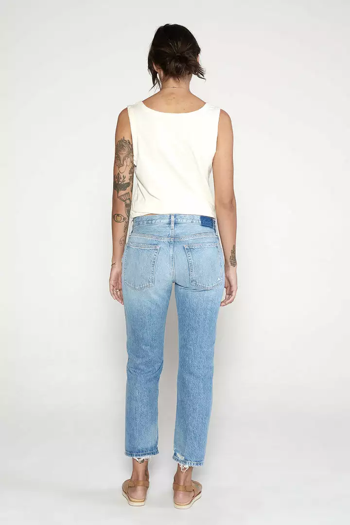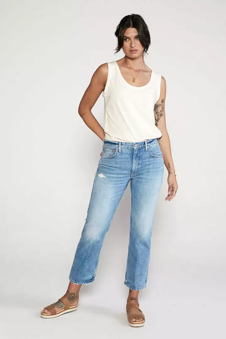 A clean straight fit with an easy rise and vintage construction. Rhea is fitted through the hip, then easy through the leg. A hearty nonstretch organic cotton denim is finished with a light seasonless wash with careful fading and abrasion.