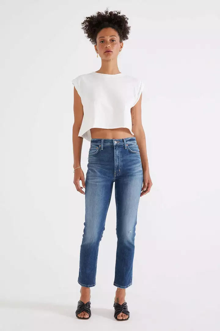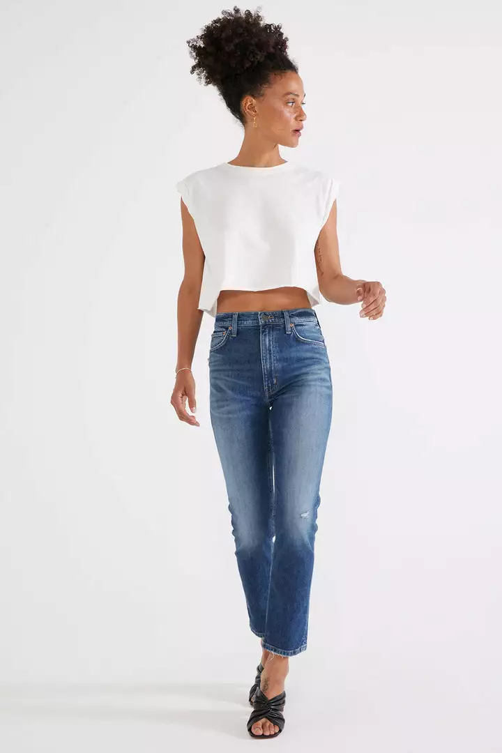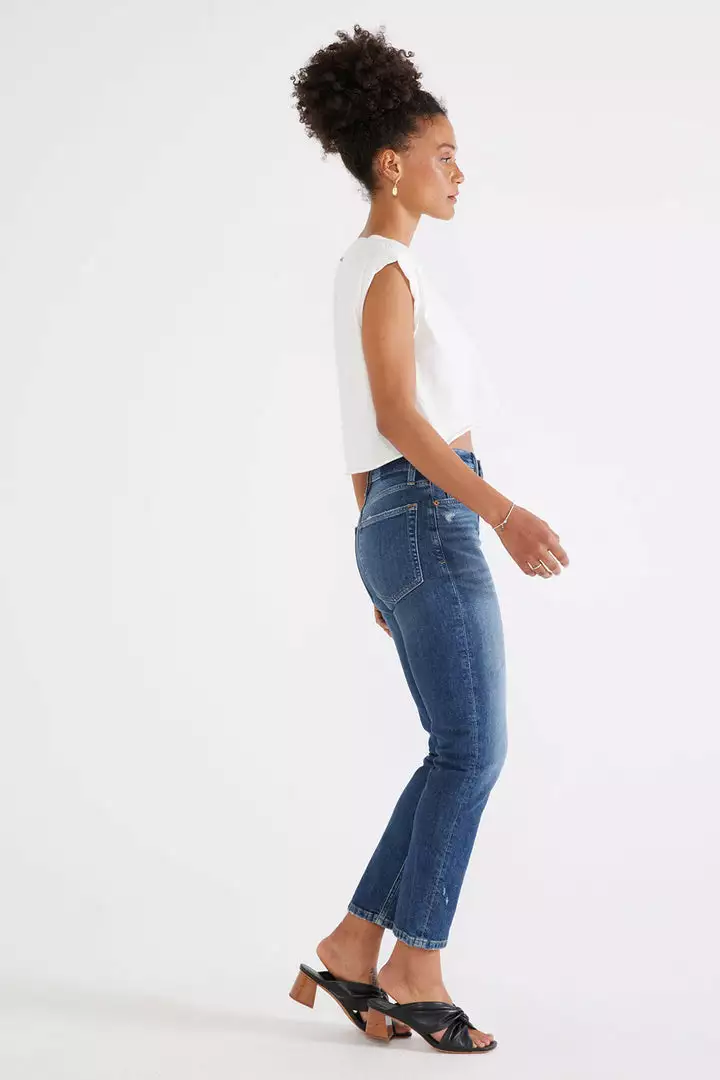 Form-fitting but never tight, Scarlet fits slim through the hip with a bit of room through the leg. A soft, organic comfort stretch denim provides movement and breathability. Finished with a seasonless Beach Break dark wash and careful fading for a lived-in look.