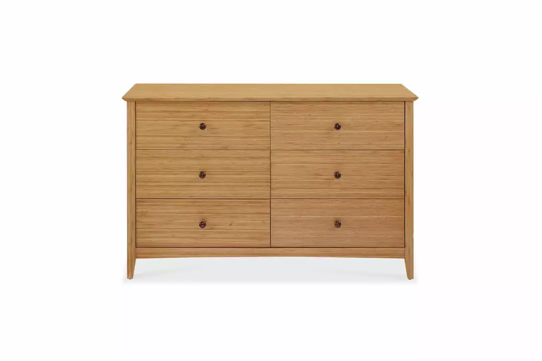 Beautifully crafted with solid bamboo, the Eco Ridge Willow double dresser features clean lines, beveled edges, and gently tapered legs to create a transitional dresser that compliments any style. The Willow Dresser features a solid reversed beveled top panel resting on a solid bamboo frame. The generous storage includes 6 solid built drawers, faced in solid bamboo, with user-friendly ball bearing extension glides. Curved base panel for added style.
