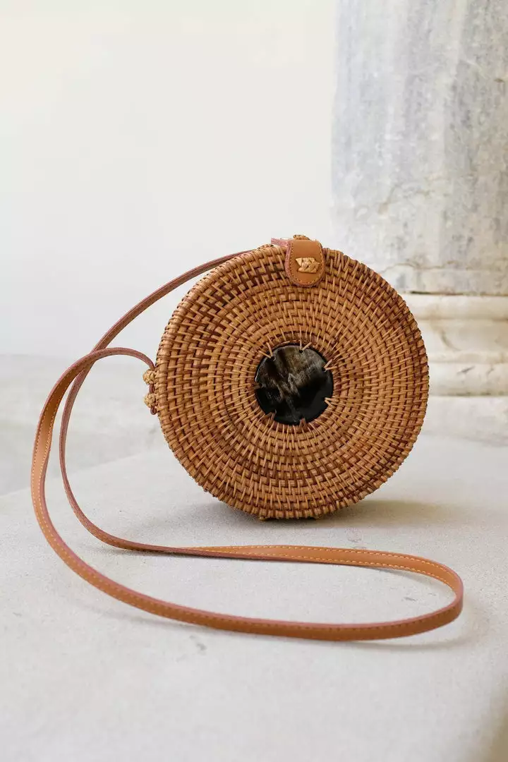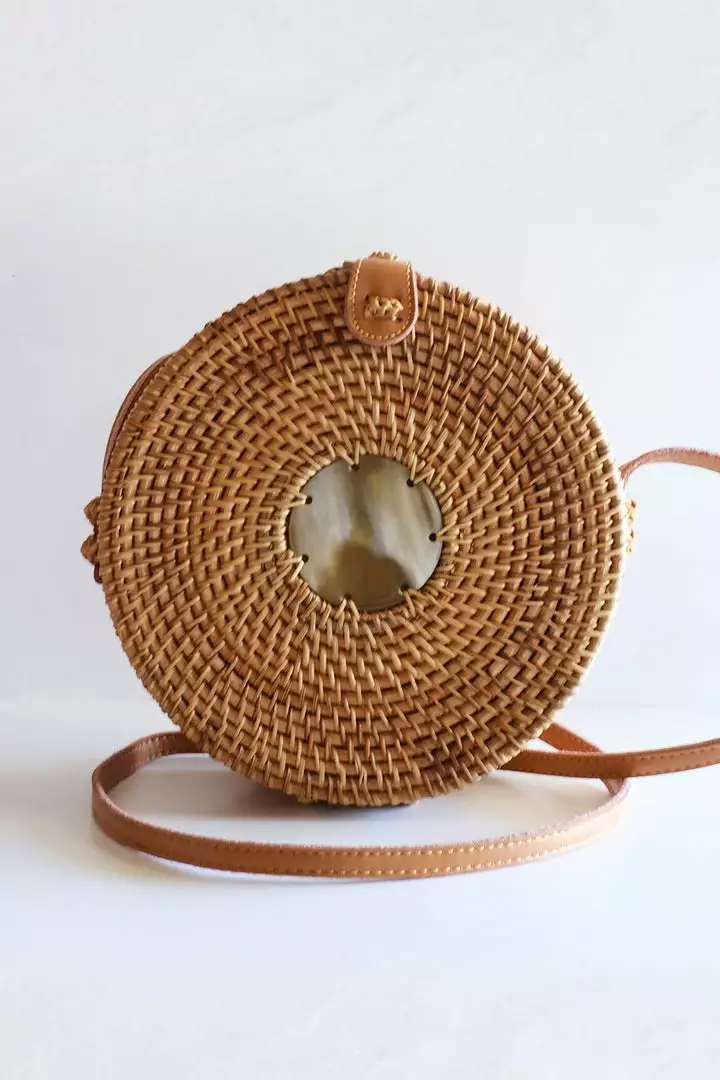 This handmade Tan Tien Bu Bag features a beautiful circular centerpiece made with ethically sourced buffalo horns. Rattan is a palm found in Southeast Asia; and similar to the strength and durability of bamboo, rattan has been used for many years to make baskets and trays.