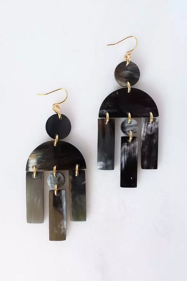 Designed to create a sustainable statement, these earrings feature many geometric shaped horn pieces to create a piece that dangles glamorously. In Vietnamese, “Hoàng Hậu” means “queen”. These opulent statement earrings are sure to bring out your royal side.