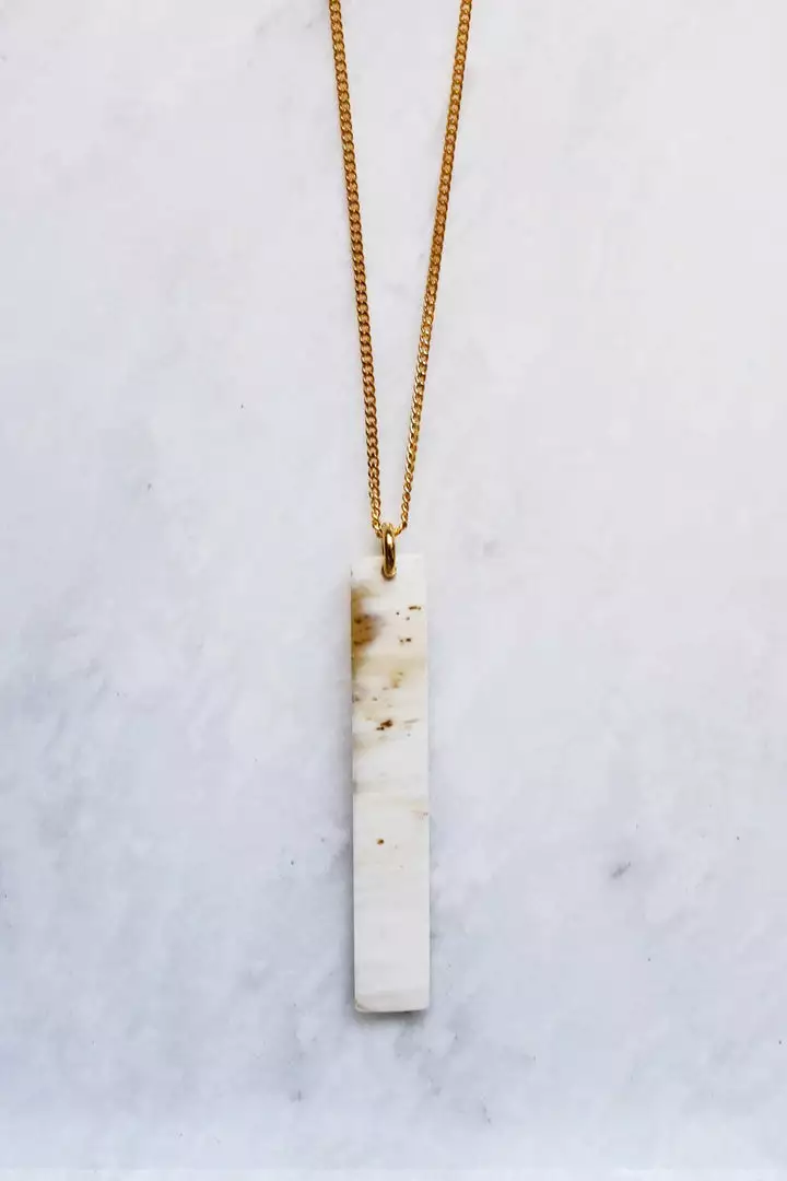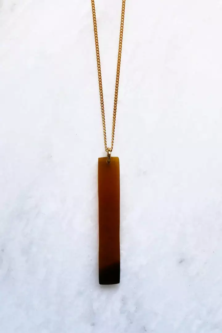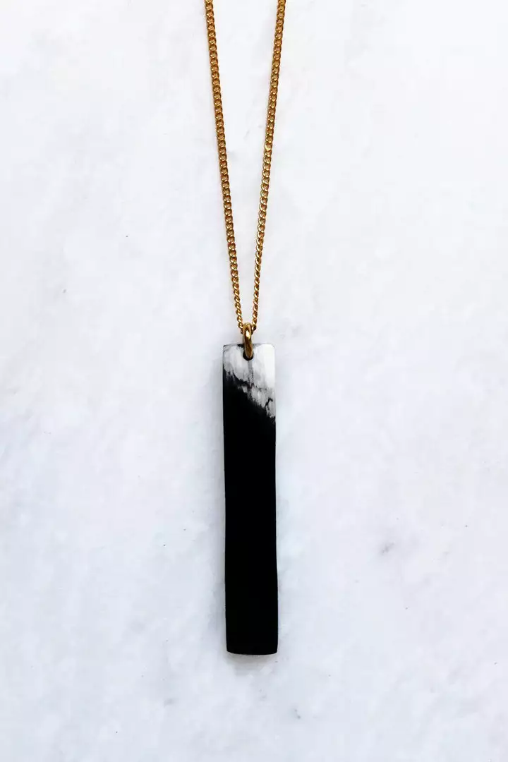 This minimalist pendant necklace features a thin bar of ethically-sourced water buffalo horn from Hanoi, Vietnam. The horn is a by-product of waste, processed chemical-free, and organic material, and a one-of-a-kind piece. This necklace can be dressed up or down for any occasion.