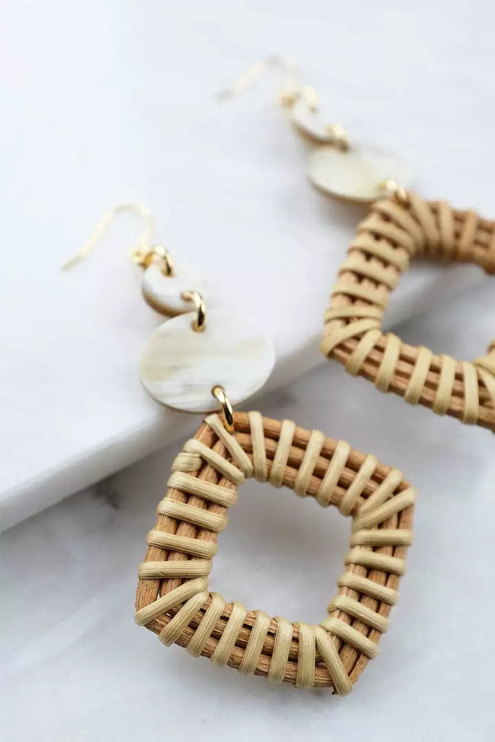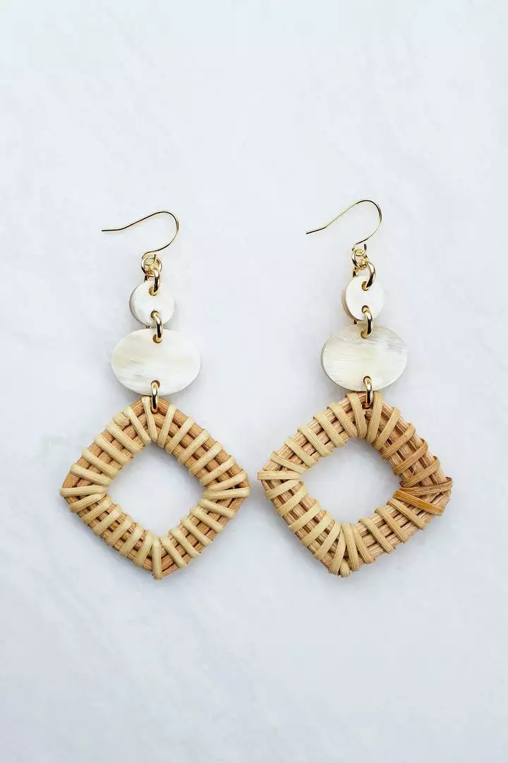 These earrings feature circular horn pieces and diamond handwoven rattan pieces to create a darling geometric silhouette with bohemian and earthy-chic textures. They are perfect to style for during the spring, summer, and fall seasons with your floral dresses or even your plain tee and denim days.