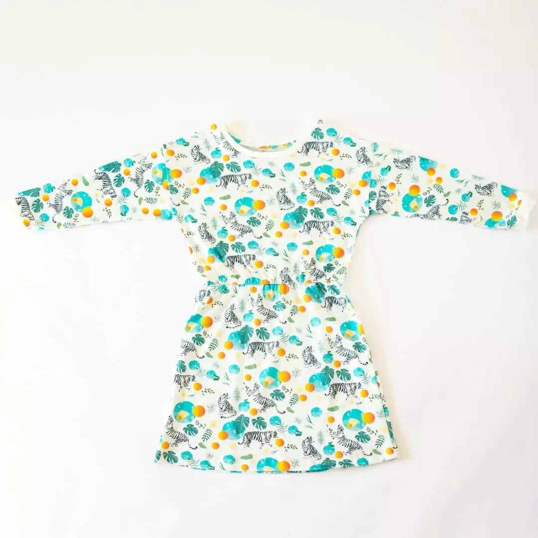 This fun jungle print dress is the perfect cold-weather piece that’s equally comfy as it is cute. Featuring an elastic waistband and cuffed organic-rib sleeves. For every dress that’s purchased, Honey Cake Tiger will plant a tree.