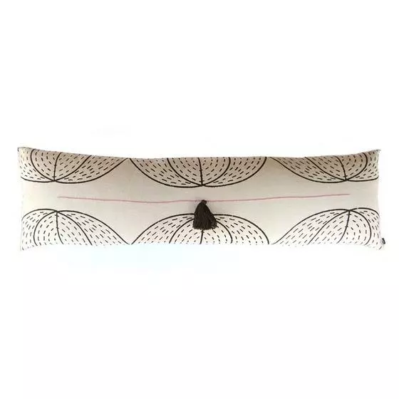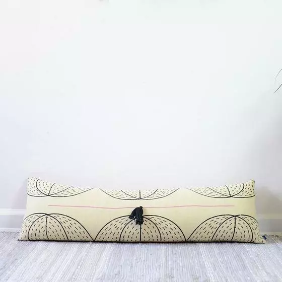 The lumbar pillow has been hand block printed on an organic khadi fabric using natural dyes. The sweet pumpkin pattern will add a playful touch to your sustainable home decor. The back is a vibrant coral color.