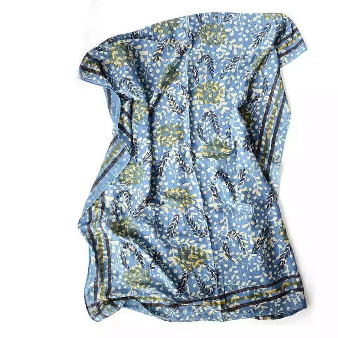 This was fun designing a block printed pattern on top of another pattern. The scarf was dyed in light indigo creating a unique seafoam color. The lightweight material makes it layerable and breezy, great for transitional weather. Please note that sizes may vary 1-2 inches and color variance may occur based on the intake of natural dyes per fabric.