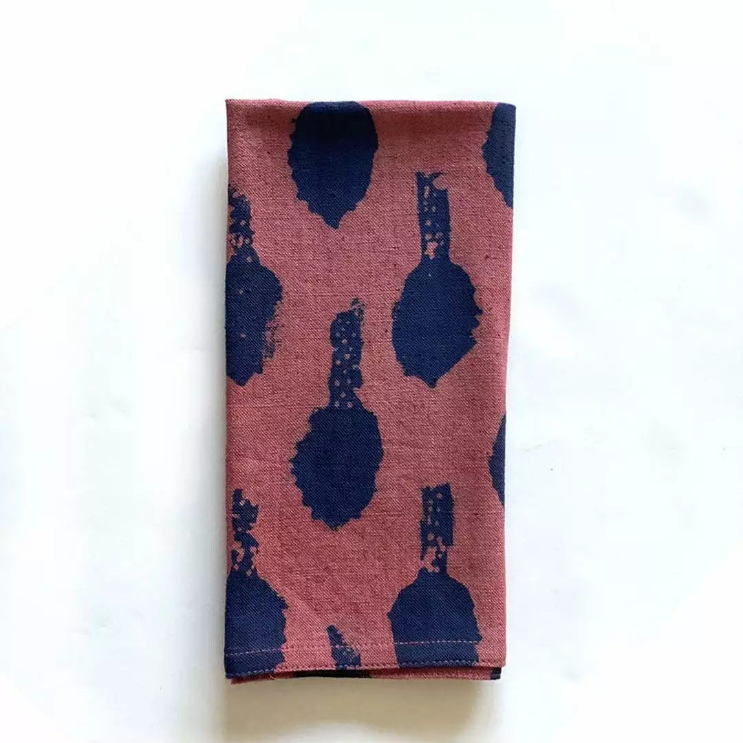 These pink and blue organic cotton cloth napkins are printed by hand using a carved wooden block and then dyed in indigo and a bath of flowers using Dabu mud resist printing.