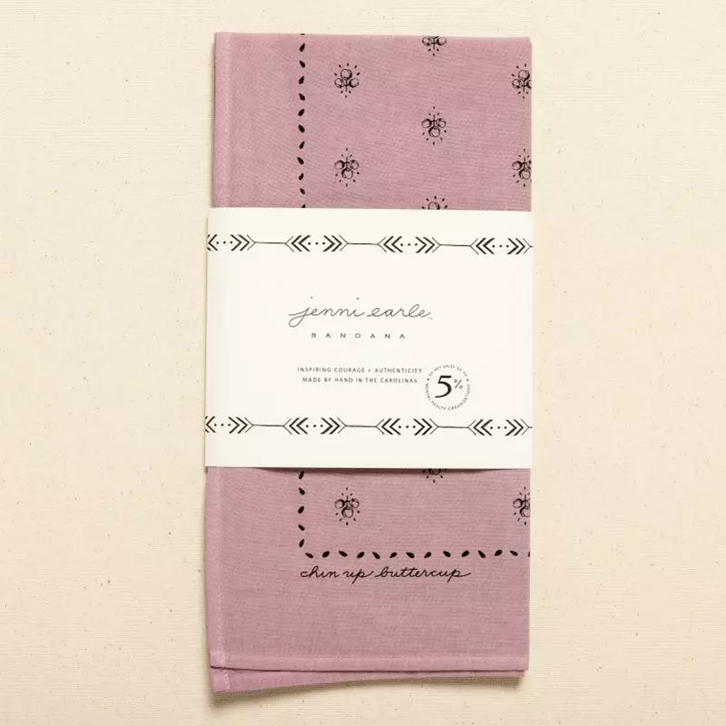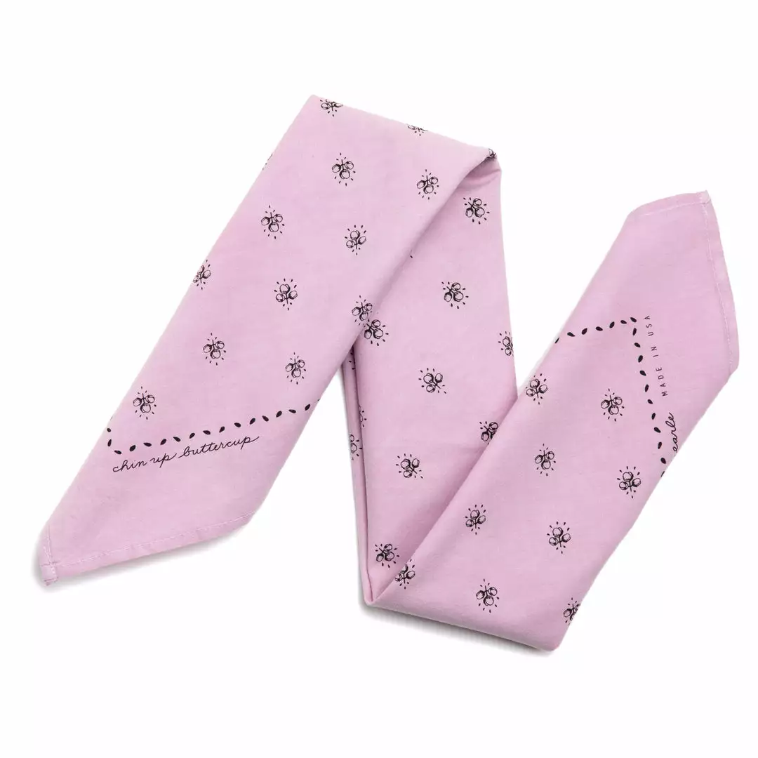 This bandana features a hand-drawn floral design, with a seeded border and center hand with an offering of a buttercup with the words “chin up buttercup” on one corner.