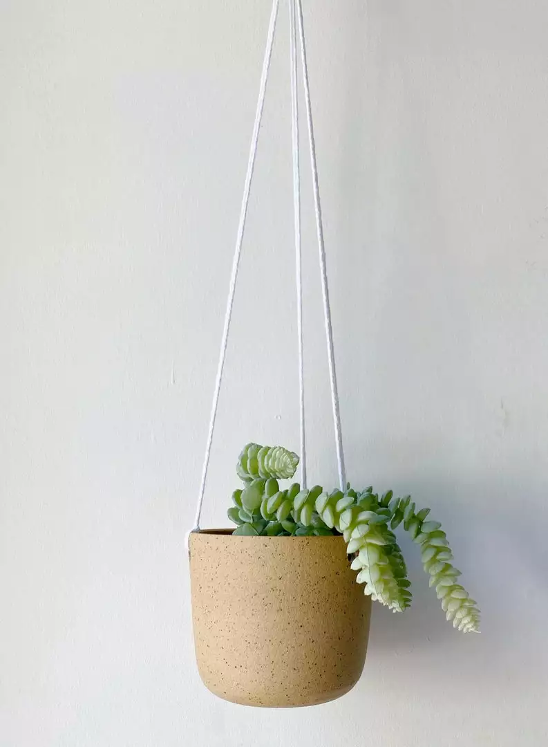 This hanging planter is simple and sleek and is the perfect addition to any plant lovers home. Features a hole in bottom for drainage.