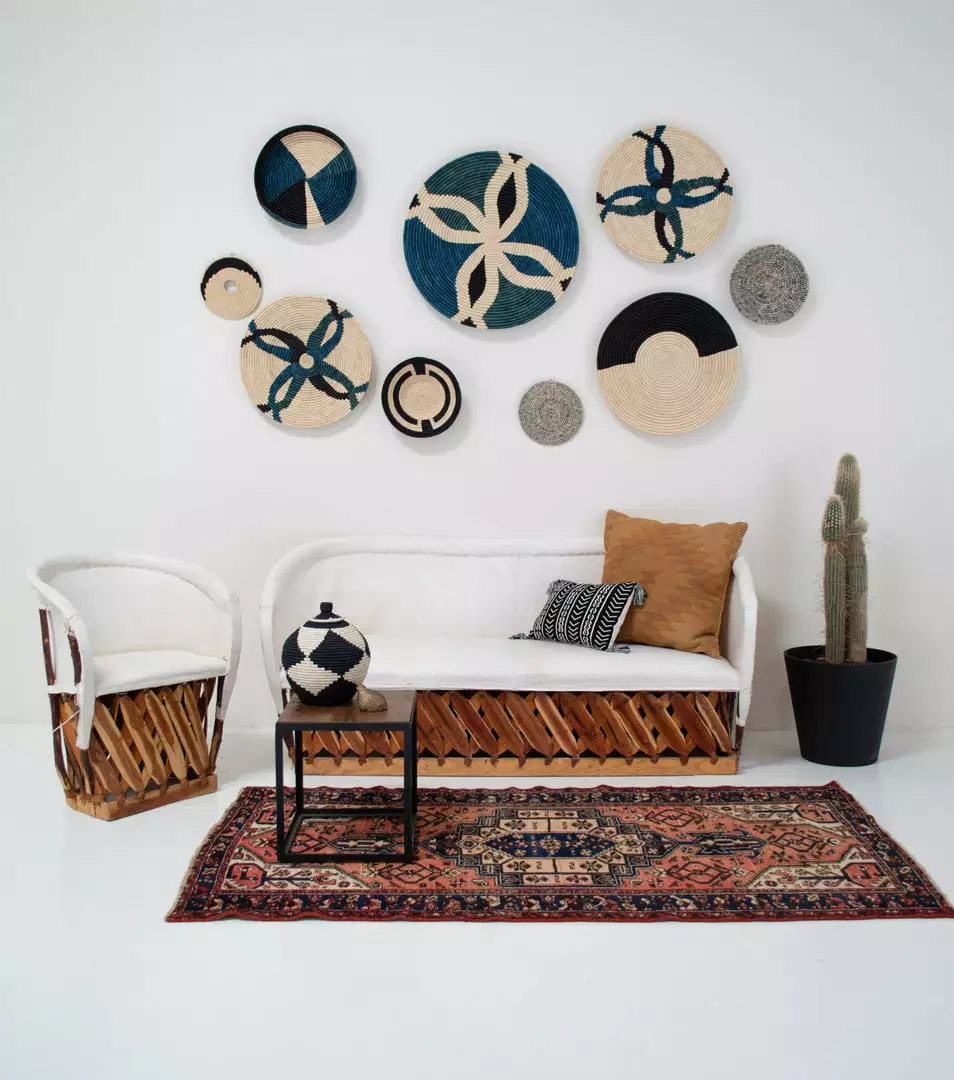 Style it in any room for a globally inspired feel. This beautiful wall plate is the perfect size as a stand alone piece or pair it with plates and trays for the cool color blocked family to create an eye-catching basket wall. All products are made by hand with love and vary slightly in color and size.