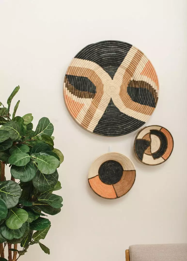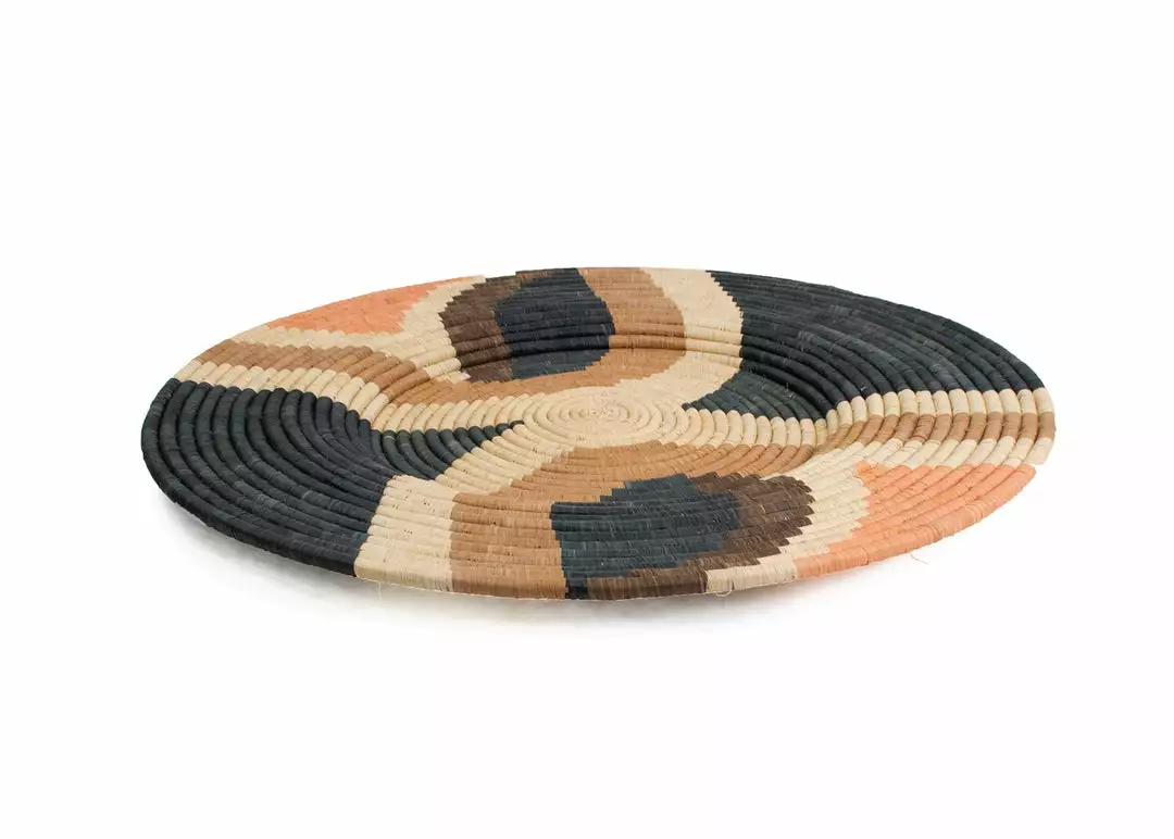 Intricately crafted with timeless tradition, this carefully dyed raffia fiber and sweet grass wall plate is a stunning statement piece. Style it in any room for a globally inspired feel. This beautiful wall plate is the perfect size as a stand alone piece or pair it with plates and trays for the cool color blocked family to create an eye-catching basket wall. All products are made by hand with love and vary slightly in color and size.