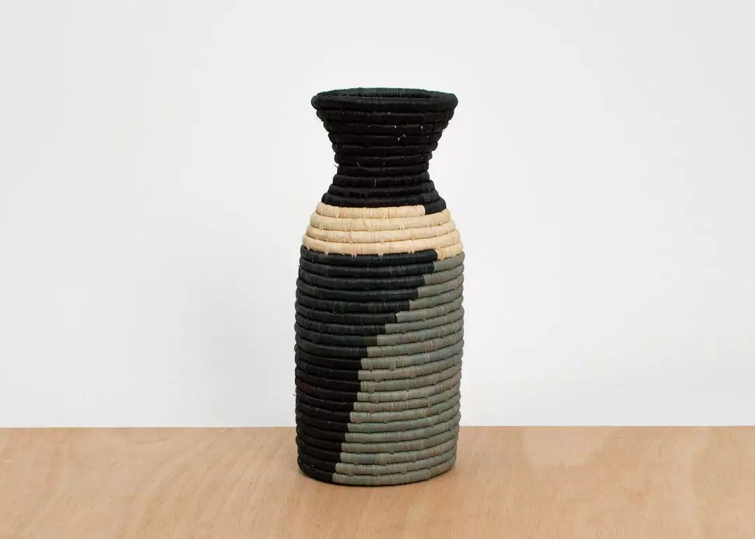 Intricately crafted with timeless tradition, this carefully dyed raffia fiber and sweet grass vase makes a stunning statement piece. One or more of these vases, will make a globally conscious and stylistic addition to your home. All products are made by hand with love and vary slightly in color and size.