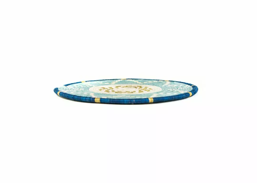 This blue and silver trivet serves as a hot pad to protect you countertop or tabletop without losing style. It is also ready to hang on your wall to add subtle color and texture to your space. Each is handwoven in Rwanda by fair trade artisans.