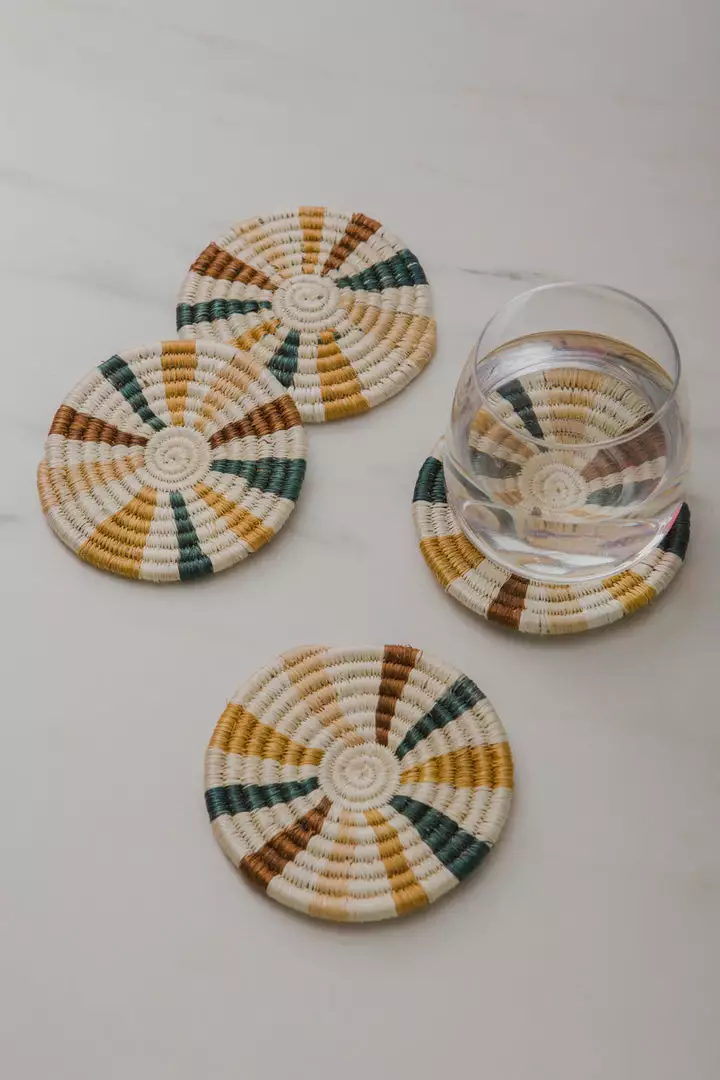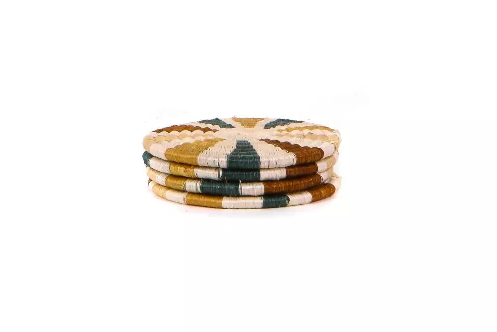 The sunburst pattern on these coasters is known as the “hope” design. Reflected on the Rwandan flag, this sunburst image stands for the country’s collective hope for a new dawn and brighter future. The coasters’ multicolored and organic look makes them versatile for use with any style decor. Use these coasters for your glass of wine in the evening, or on the living table when enjoying your early morning cup of coffee. Made with organic dyes.