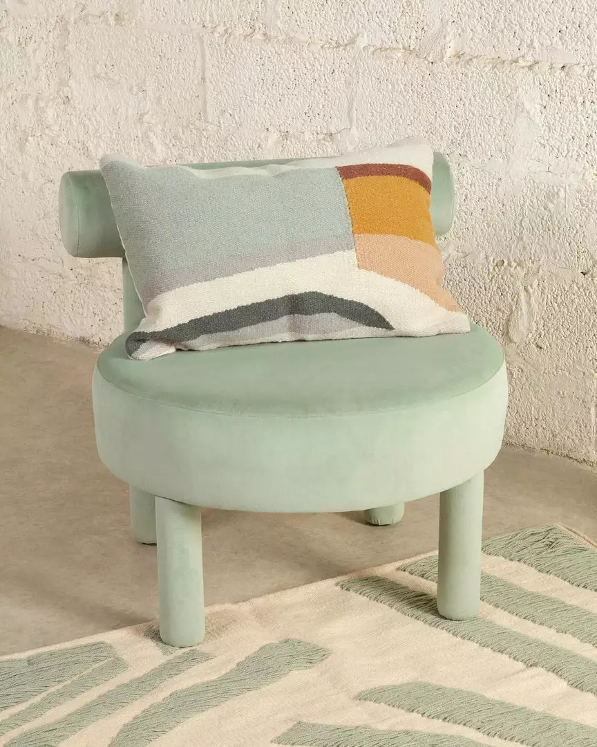 All of the colored wool yarn in their rugs and pillows is spun from upcycled remnants from Cairo carpet factories to make use of fibers that may otherwise be discarded. Slight variations and imperfections are embraced.
