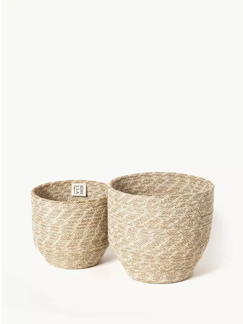 The Agora Bin Set includes two white and natural jute baskets. Use them as an attractive way to store various items in your home or office, or use them to pot your houseplants. Each basket is made with ethically sourced, natural materials and handwoven in a fair trade environment. Variation is celebrated handcrafted products.