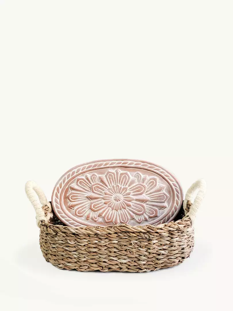 Thereβs nothing quite like the smell of warm bread on the weekend. Here, a terracotta plate has been engraved with aΒ flower design and cut to fit neatly into an oval basket. This special bread warmer is naturally insulating, and the basket itself has been handwoven from sustainably grown seagrass.Β Variation is celebrated with handcrafted products.