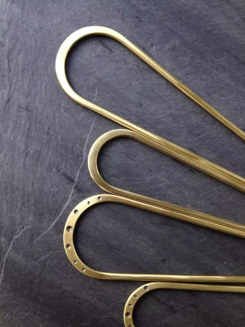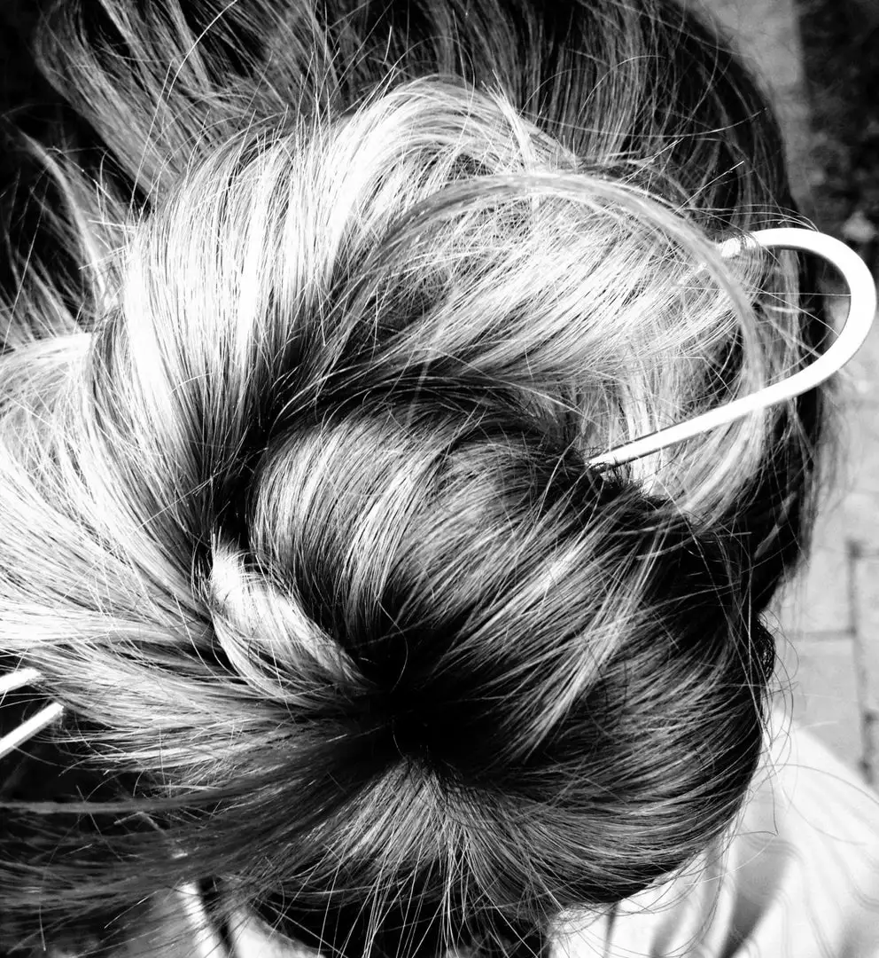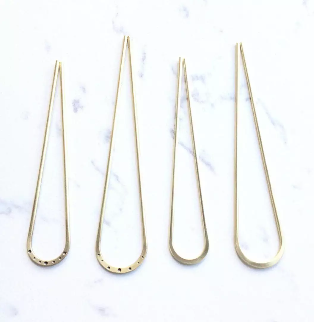 This brass hairpin is a simple and stylish way to keep your hair back. No snags or getting a ponytail holder tangled in your hair. Simply pull the tongs apart and insert them into your hair. Perfect for messy or neat buns, top buns, or French twists.