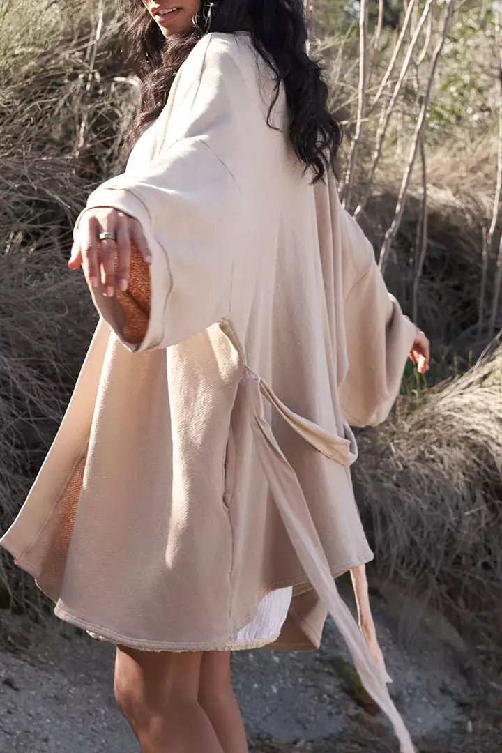 This oversize layer is made of almost 3 yards of heritage loop terry. It features generous sleeves and a removable jersey sash. We love this for lounging or to top off an outfit for a decadently relaxed look.