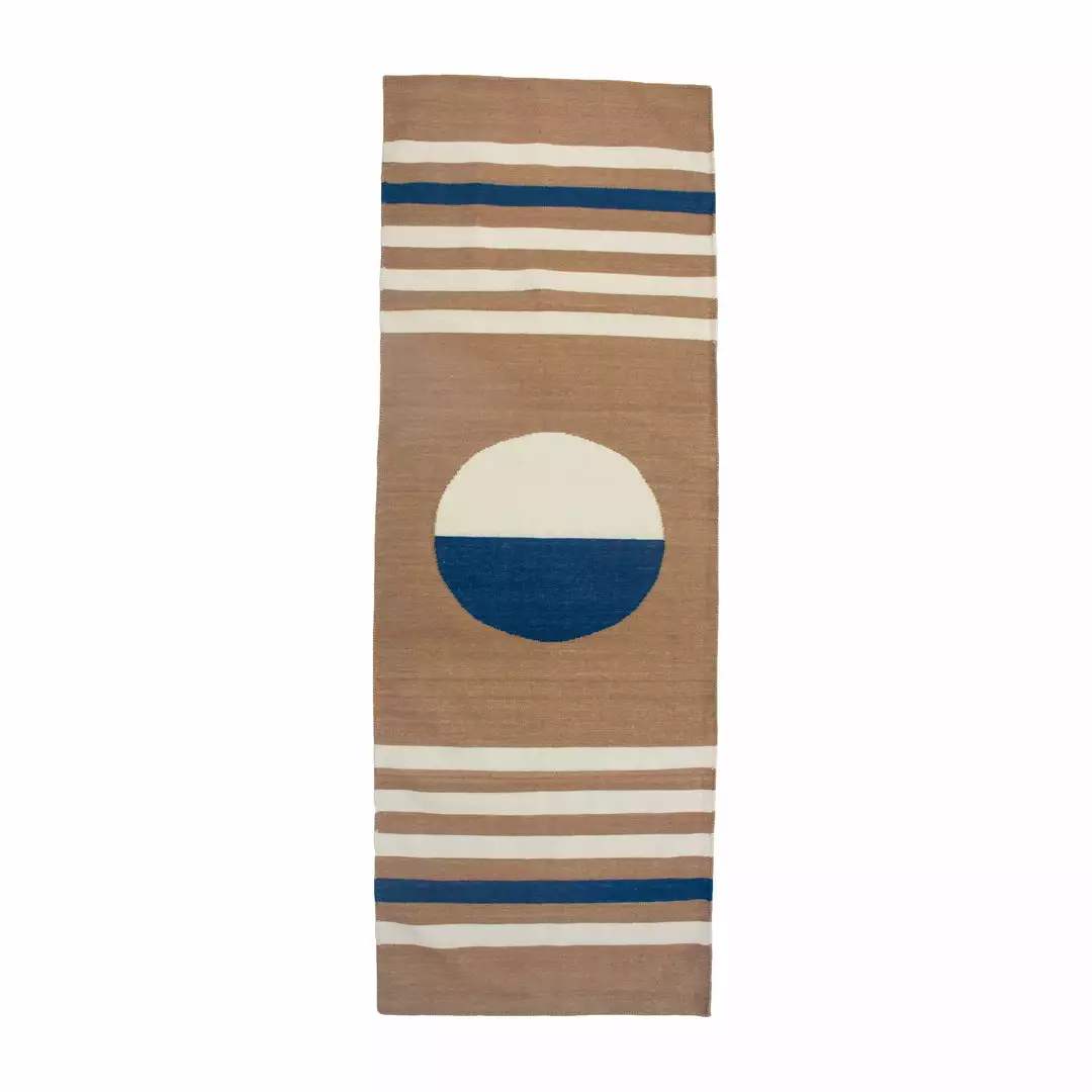 This geometric area rug has been ethically handwoven in the finest wool yarns by artisans in Rajasthan, India, using a traditional weaving technique that is native to this region. The purchase of this handcrafted rug helps to support the artisans and preserve their craft.