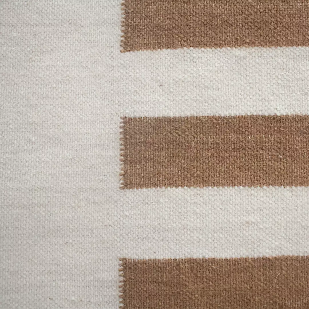 This geometric area rug has been ethically handwoven in the finest wool yarns by artisans in Rajasthan, India, using a traditional weaving technique that is native to this region. The purchase of this handcrafted rug helps to support the artisans and preserve their craft.