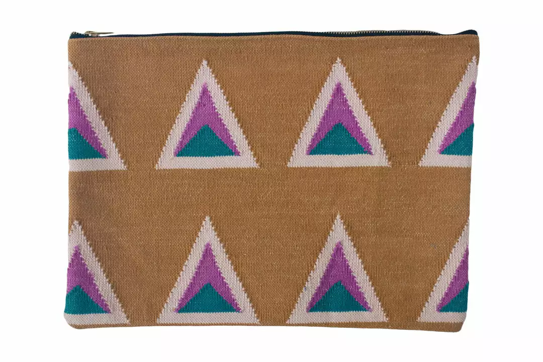 This geometric clutch features a handwoven front and a black leather backing. The front is ethically handwoven by artisans in Rajasthan, India, using a traditional weaving technique that is native to this region. The purchase of this handcrafted clutch helps to support the artisans and preserve their craft.