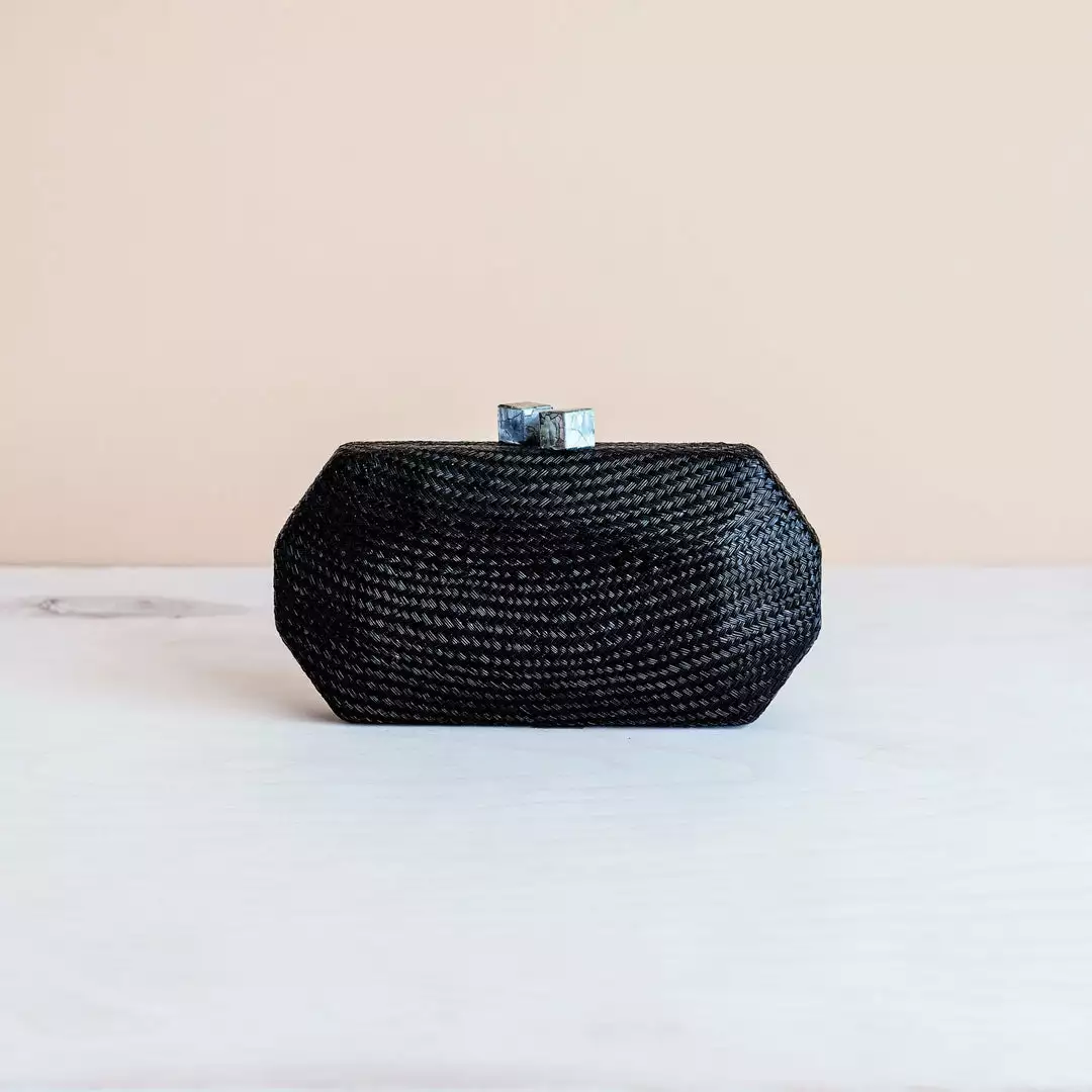 A jet black clutch to suit every mood. The ideal size for a phone and the essentials. The Black Woven Clutch is handwoven from natural plant fibers carefully extracted from the stalks of the tropical buri palm in the Philippines. Accented with an iridescent black mother of pearl lock clasp. Mother of pearl sourced as a byproduct of the food industry. Every purse is made by hand and may have slight variations in color, pattern, or texture.
