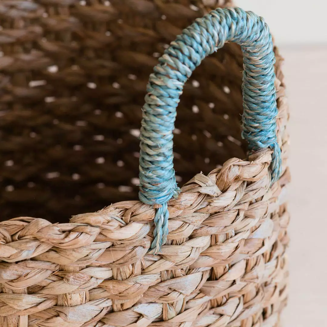 The Sky Blue Handle Basket Set is a set of three natural, woven baskets in various sizes with a delicate pop of blue on the handles. These baskets will give any space in your home a natural touch and texture while providing an attractive storage solution for a variety of items in your home.