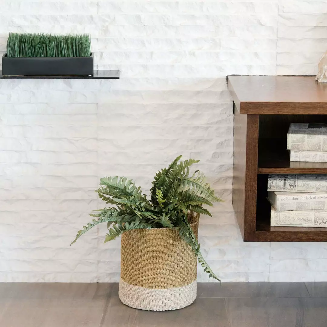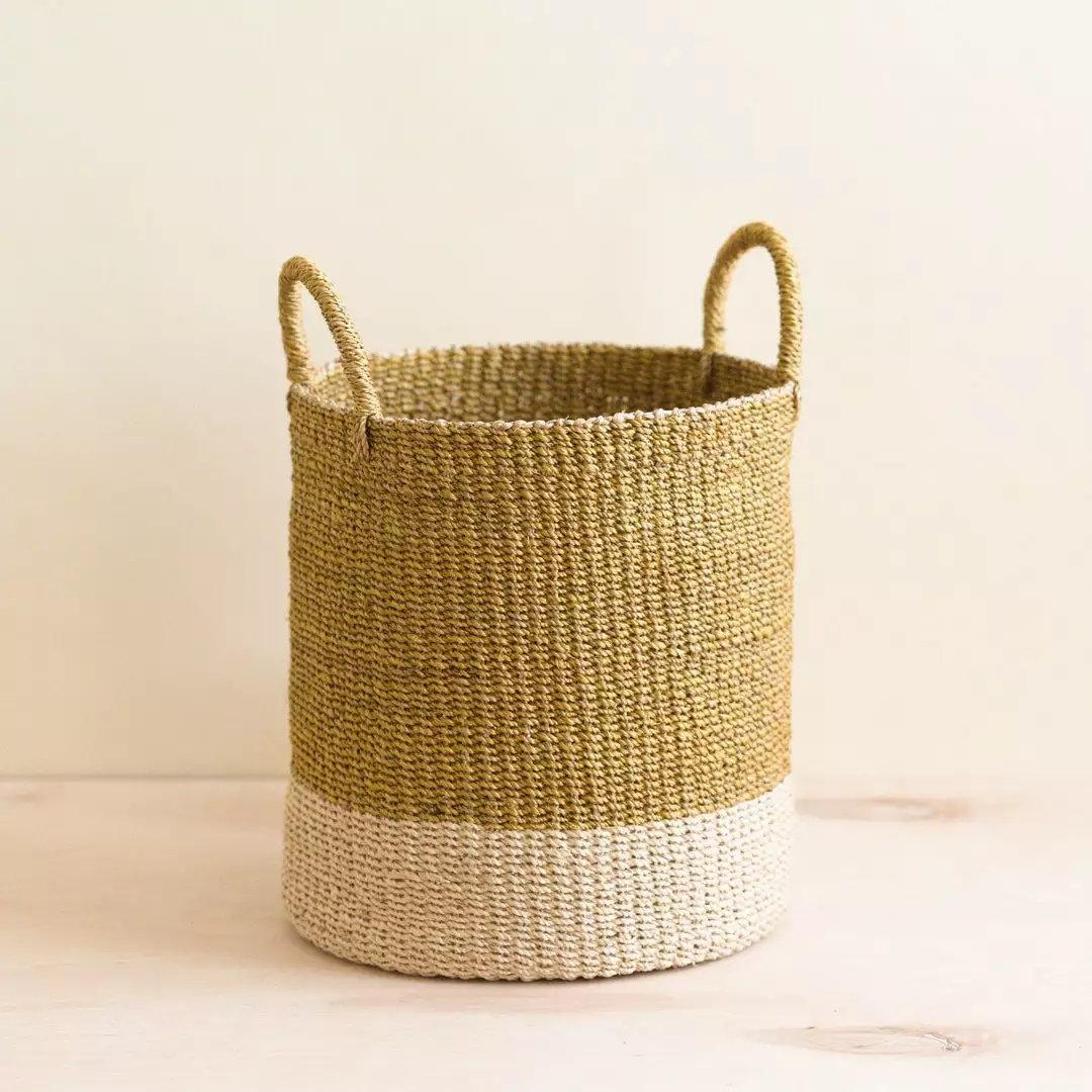 The Mustard Floor Basket is a handcrafted mustard and beige floor basket to brighten up your home and provide functional and stylish storage. The size makes it great for storing and organizing a variety of items in your home, and the handles make it easy to take from room to room. We also love it as a natural textured planter for houseplants.