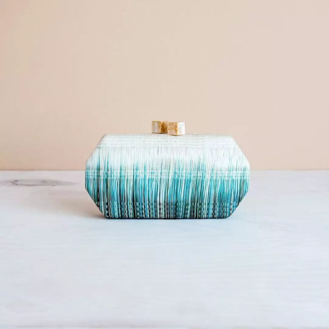 An exquisite clutch with tropical vibes. Turquoise like the sea. The ideal size for a phone and the essentials. The Teal Woven Clutch is handwoven from natural plant fibers carefully extracted from the stalks of the tropical buri palm in the Philippines. Accented with an iridescent yellow mother of pearl lock clasp. Mother of pearl sourced as a byproduct of the food industry. Every purse is made by hand and may have slight variations in color, pattern, or texture.