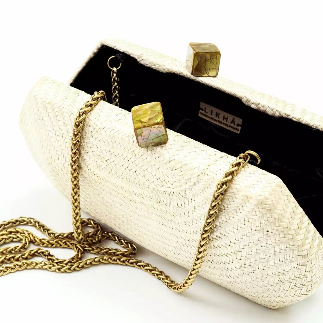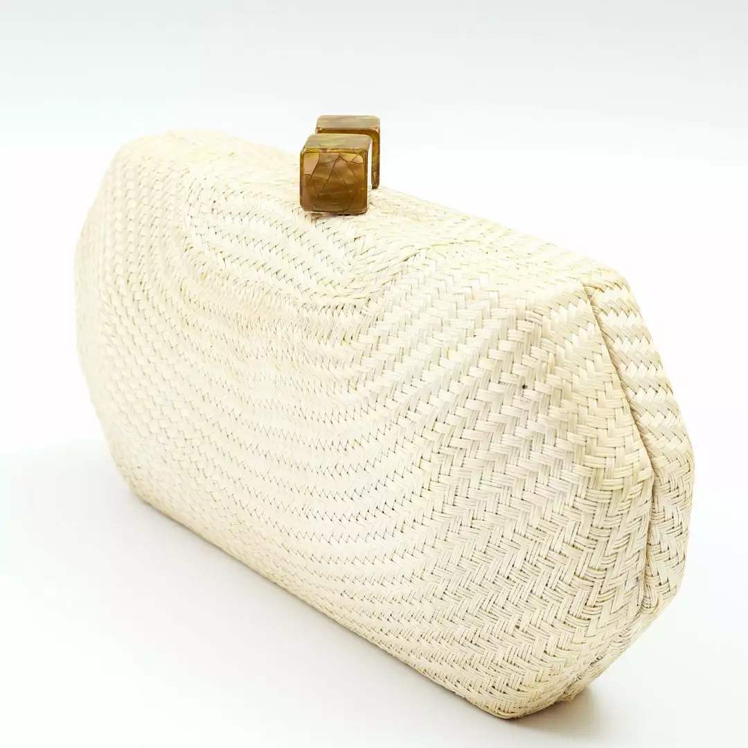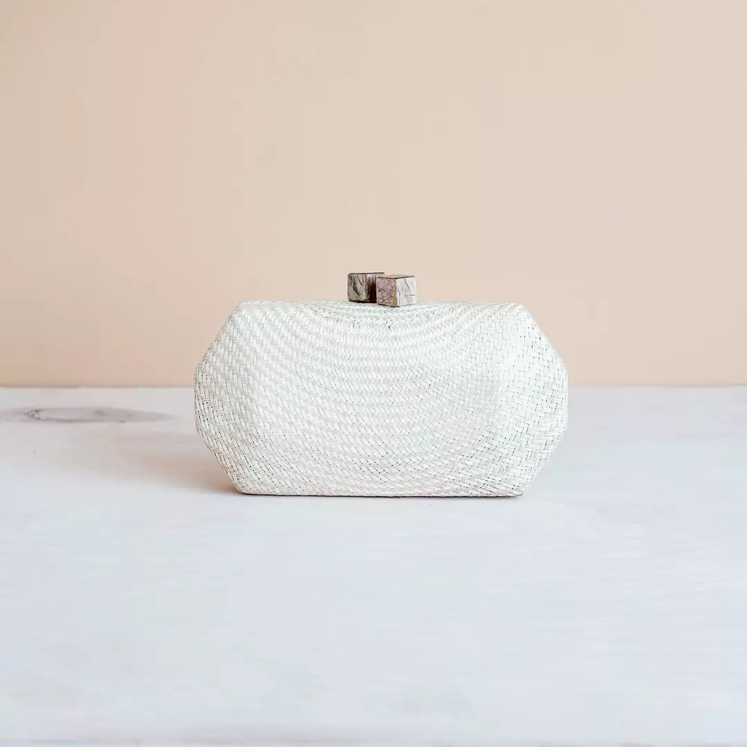 A clutch for the classy multi-tasker, day-to-nighter. The ideal size for a phone and the essentials. The White Woven Clutch is handwoven from natural plant fibers carefully extracted from the stalks of the tropical buri palm in the Philippines. Accented with an iridescent brown mother of pearl lock clasp. Mother of pearl is sourced as a byproduct of the food industry. Every purse is made by hand and may have slight variations in color, pattern, or texture.