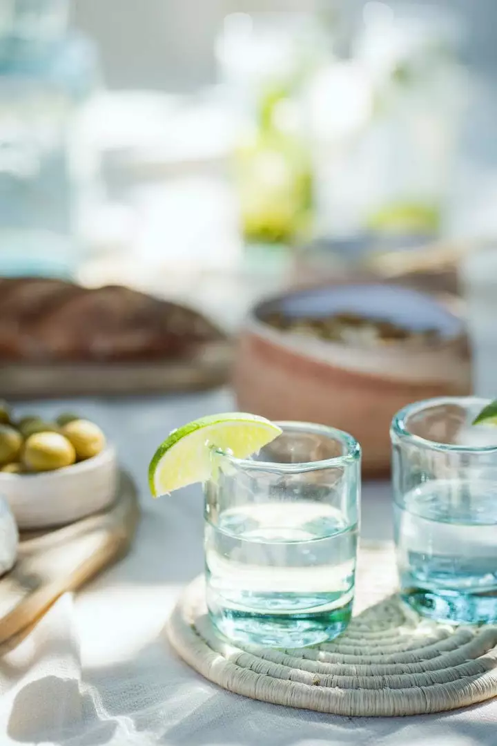 The Mini Glass Set is handmade by Cristal Artesanal in Bogotá, Colombia from recycled glass. These adorable little glasses have wavy detailing and a subtle turquoise hue. Their size and shape make for an excellent shot glass, taster glass, or dessert glass.