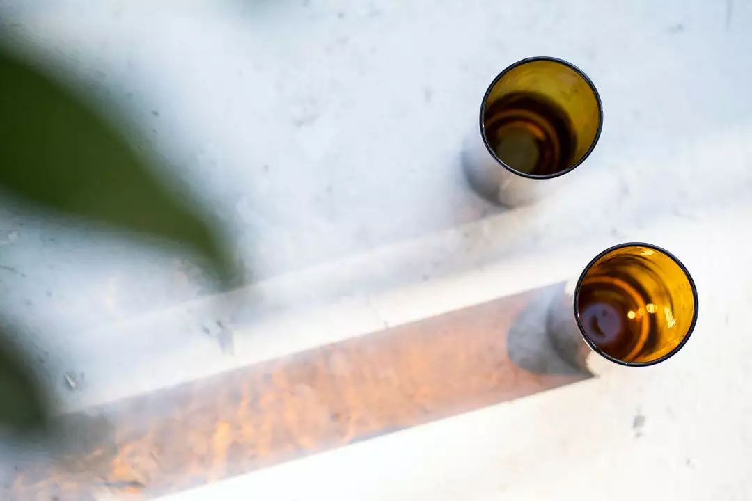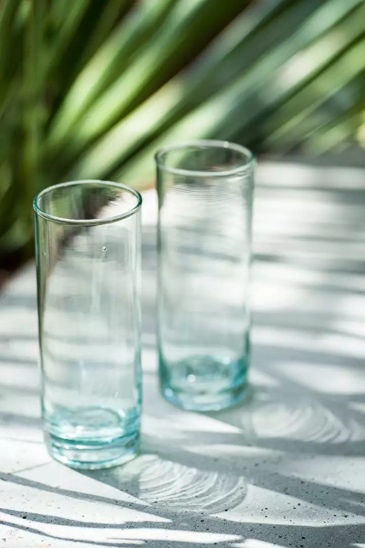 The Tall Recycled Glass Set of 4 is a minimalist highball set for everyday use and cocktail hour alike. Artisans at Cristal Artesanal in Bogotá, Colombia make the Aqua set with mouth-blown recycled glass, and the Amber set from recycled beer bottles. Each glass is handmade, slight variations and imperfections occur.