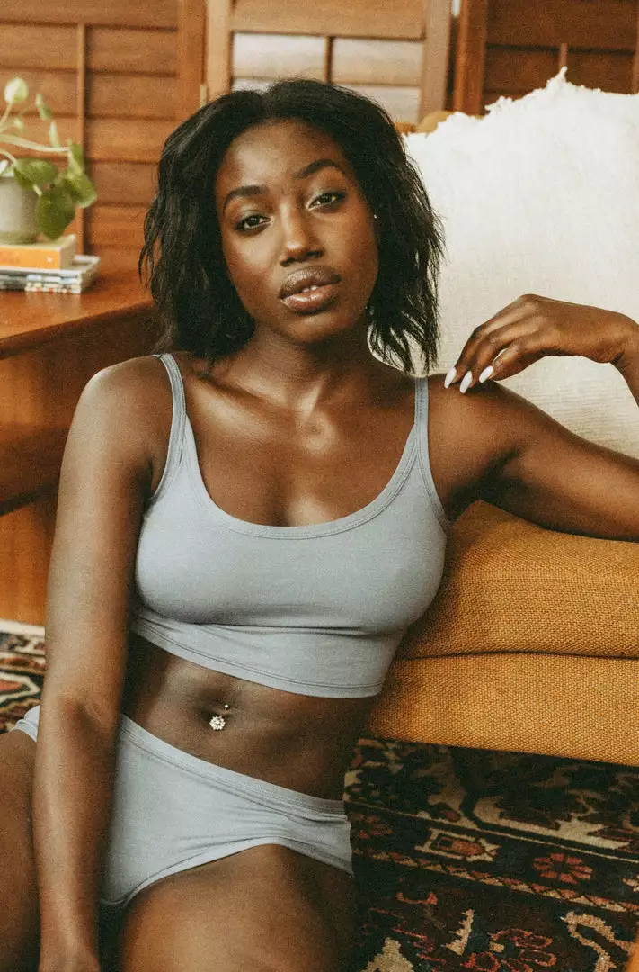 Melina (Gray) is 5’4, a 34B, and wears a Small.
