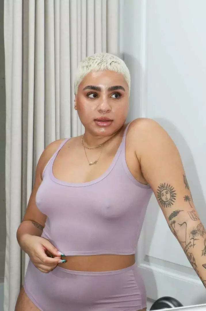 Jonelle (Lavender) is 5’4″, a 36B and wears a Large.