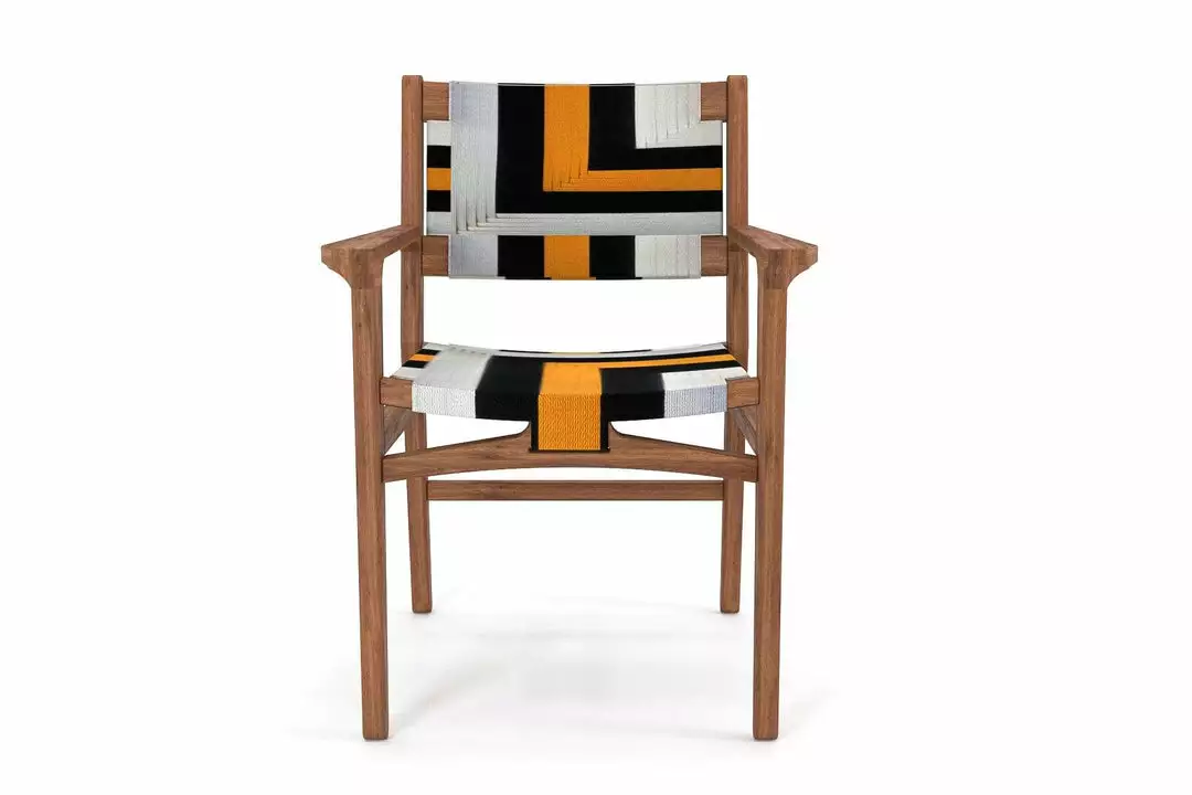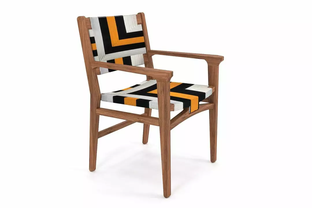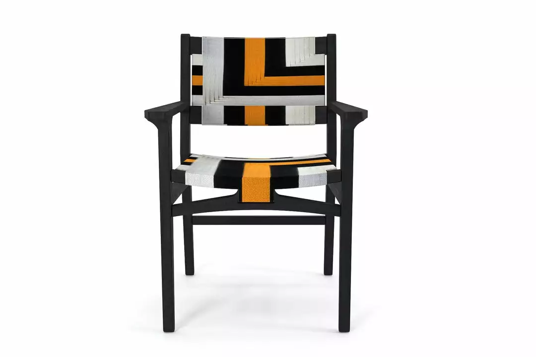 Modern yet timeless, the Chontales Arm Chair in the Queen Bee pattern is handcrafted by artisans in Nicaragua from sustainably sourced wood. Featuring a handmade, solid wood frame with armrests and a handwoven seat and backrest, the Queen Bee’s bold, black, yellow, and white geometric design will create a buzz in any of your living spaces.