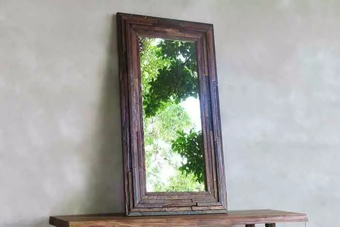 A stylish all solid wood framed mirror makes a tasteful hall, living room, or bedroom mirror. The frame is made from a mix of Rosita Walnut, Royal Mahogany and Teak, blended together in a rustic fashion to provide a solid and attractive frame for this large rectangular mirror.