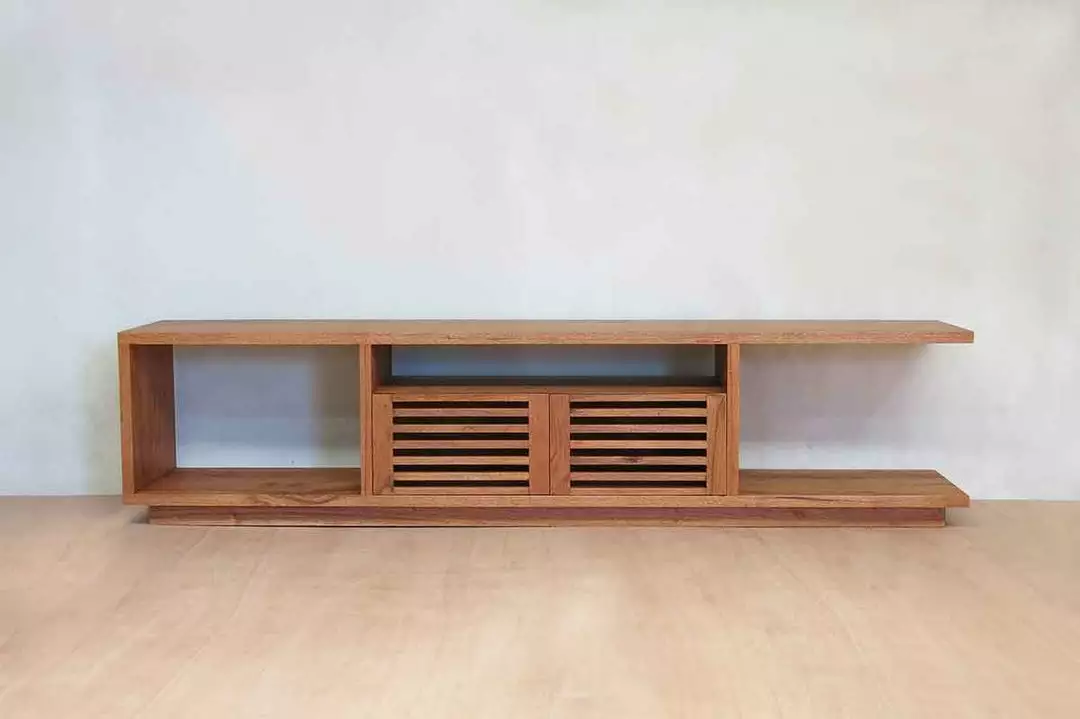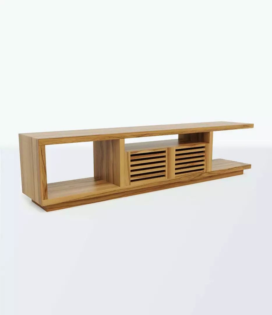 This modern wood TV console is both stylish and incredibly well built. This piece comes fully assembled and is built entirely from solid sustainably harvested tropical hardwood.
