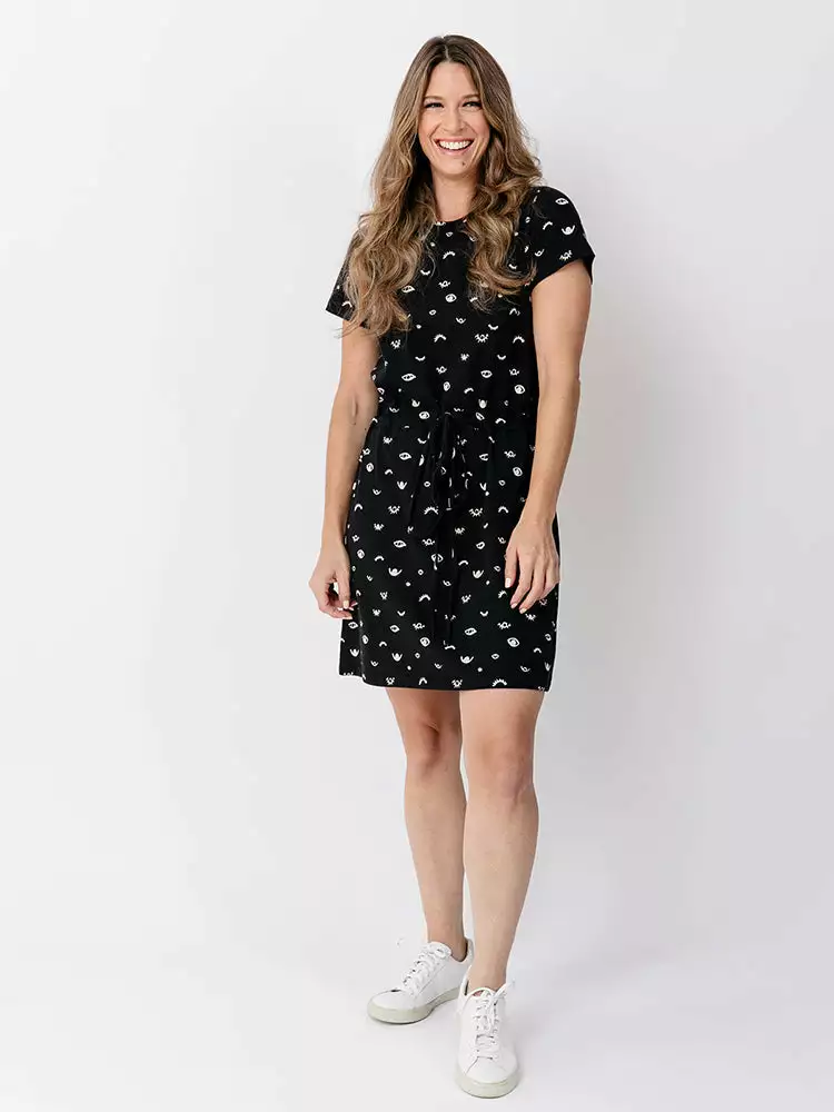 Organic cotton jersey makes for the perfect casual LBD for warm weather, and this bold eye print adds fun to a classic black and white color combo. Adjust the drawstring for a loose tunic dress fit, or cinch the waist for a more defined fit.