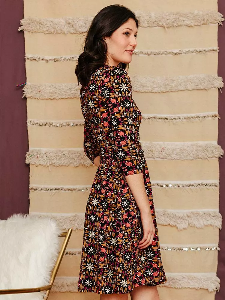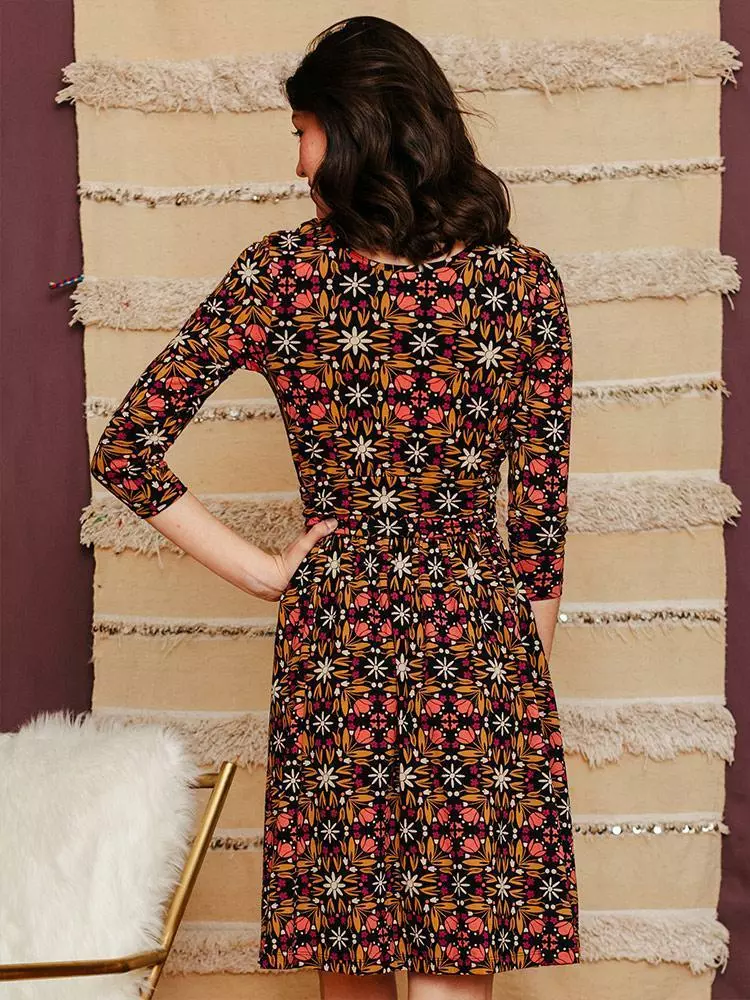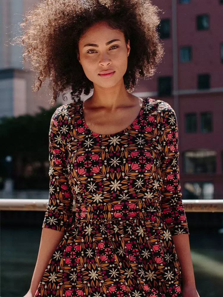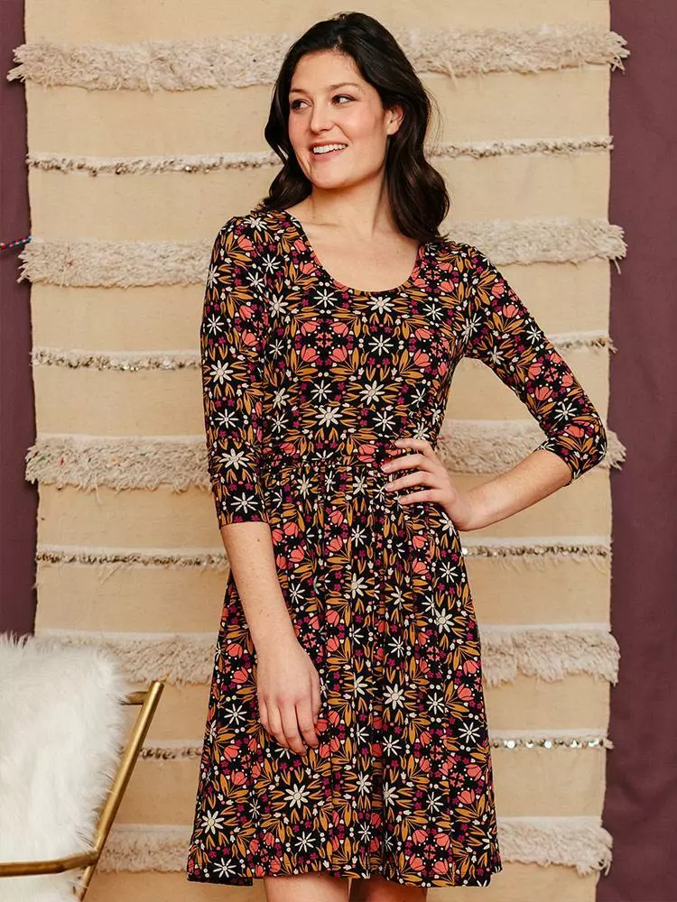 The retro floral print on this 3/4 sleeve organic cotton jersey dress says it all.