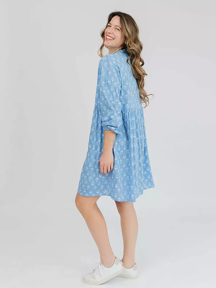 The Sohla flowy mini dress has a tunic-style shape and just-short-enough length for an on-trend style with casual comfort. Featuring tie details at the neck, hand embroidery, and hand block printed blue modal fabric.