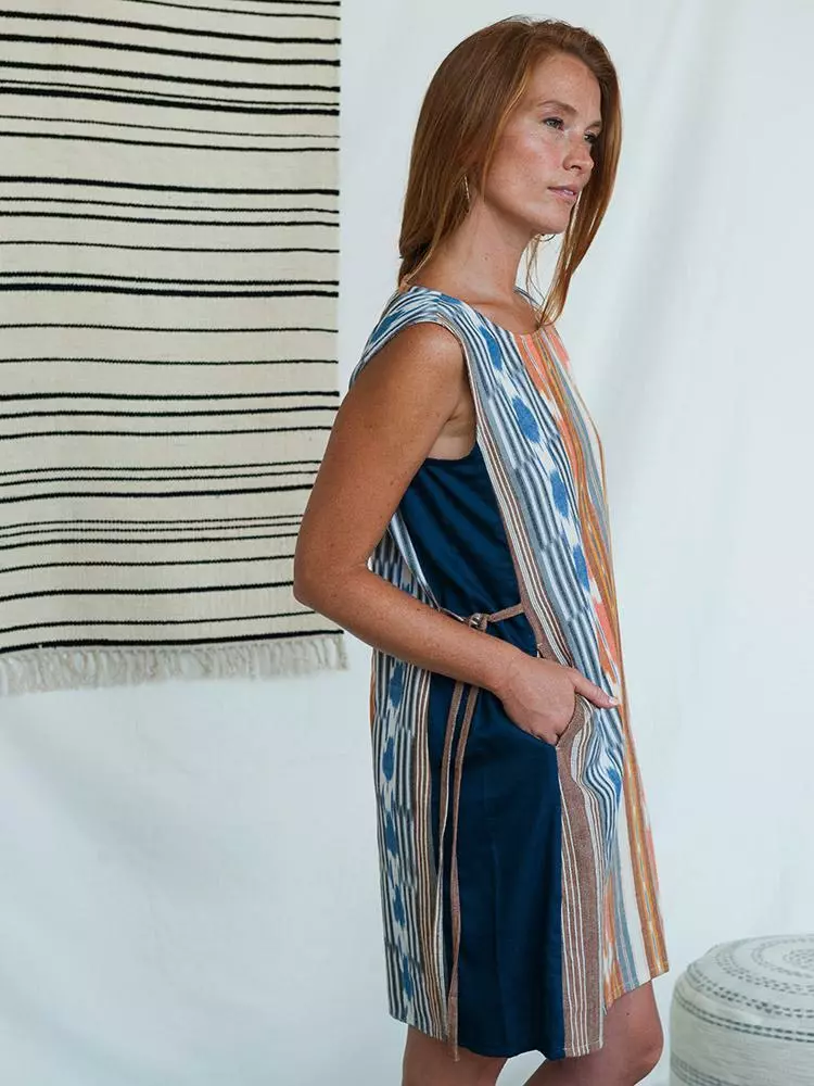 Your closet is calling for a handwoven shift dress, dyed in a beautiful rainbow ikat. Adjustable ties and hidden pockets really sweeten the style.