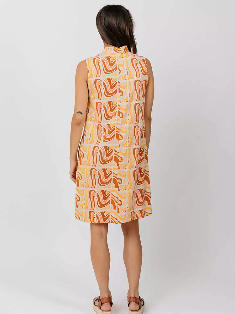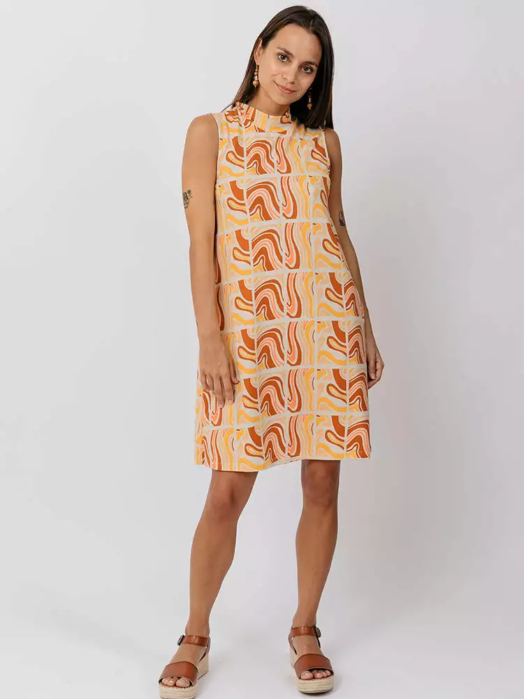 The Eve features a mod, mock neck top with a sleeveless bodice that’s ready for warm weather. Featuring super-soft organic cotton jersey in a desert-inspired print, Eve is ready to throw on and go.