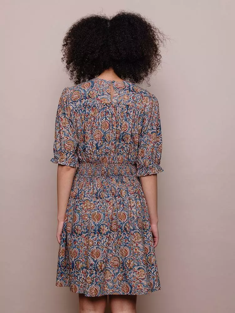 Henrietta is ready to be a date night dress with romantic ruffles, pleats, and a ruched waist. Featuring traditional block print fabric and natural dyes, this style is ready to be a conversation starter.