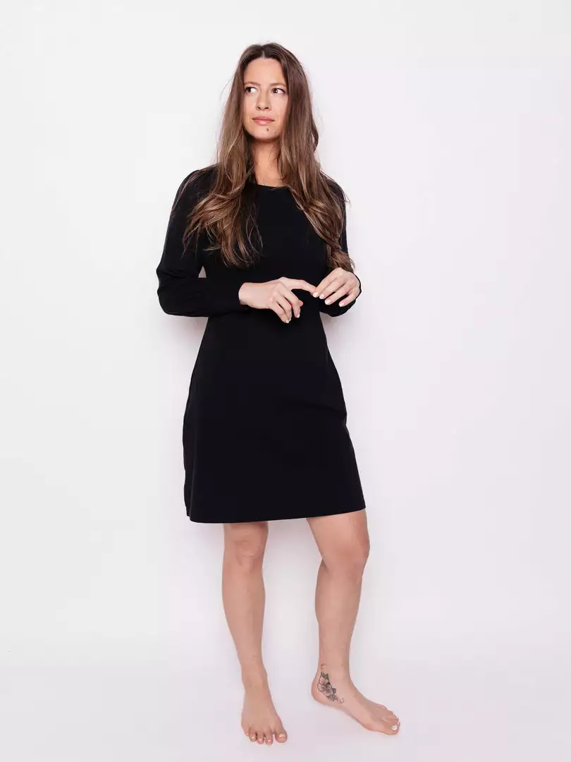 The Paula mini black dress has bold elastic cuffs, a mini length, scoop neckline, and subtle shoulder details take organic cotton jersey from everyday to nighttime chic.