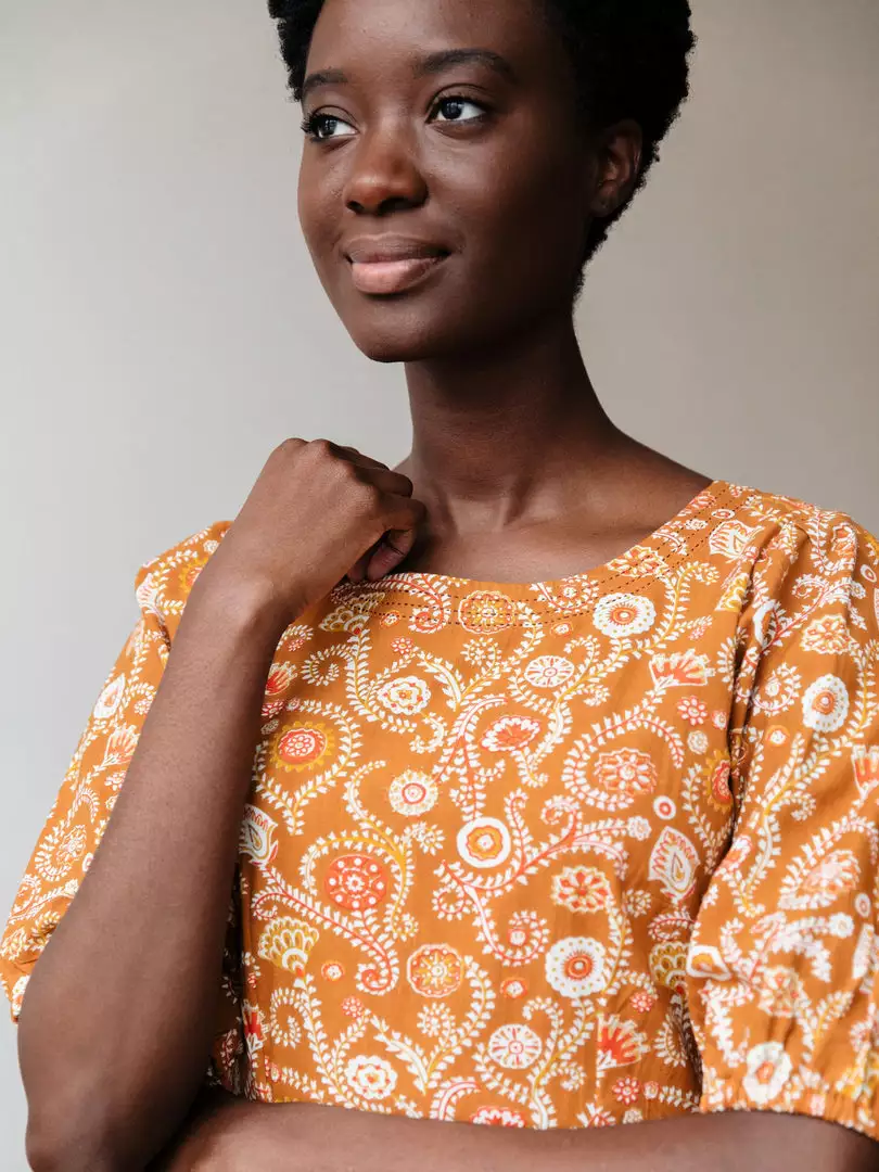 The Sydney Midi Dress has the one of a kind details that Mata is known for: hand embroidery adorns the neckline of this suzani-inspired print, puff sleeves add visual interest, and pockets. We can see this dress everywhere from the office to a fall soiree.
