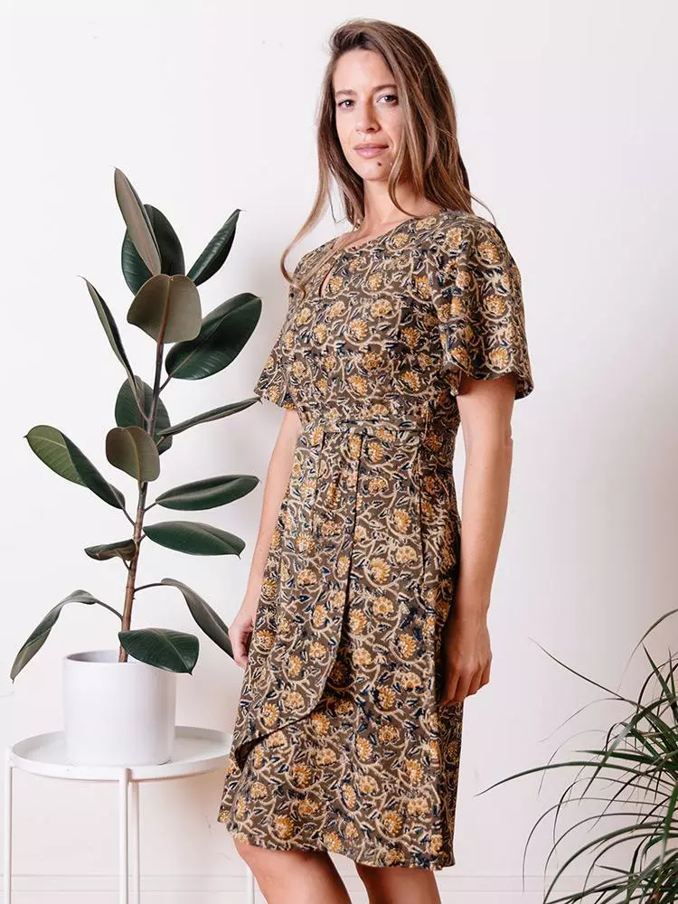 This flutter sleeve dress features a faux wrap style with an adjustable tie belt in a traditional hand block print. The keyhole neck adds a sweet detail that makes this dress even more unique.